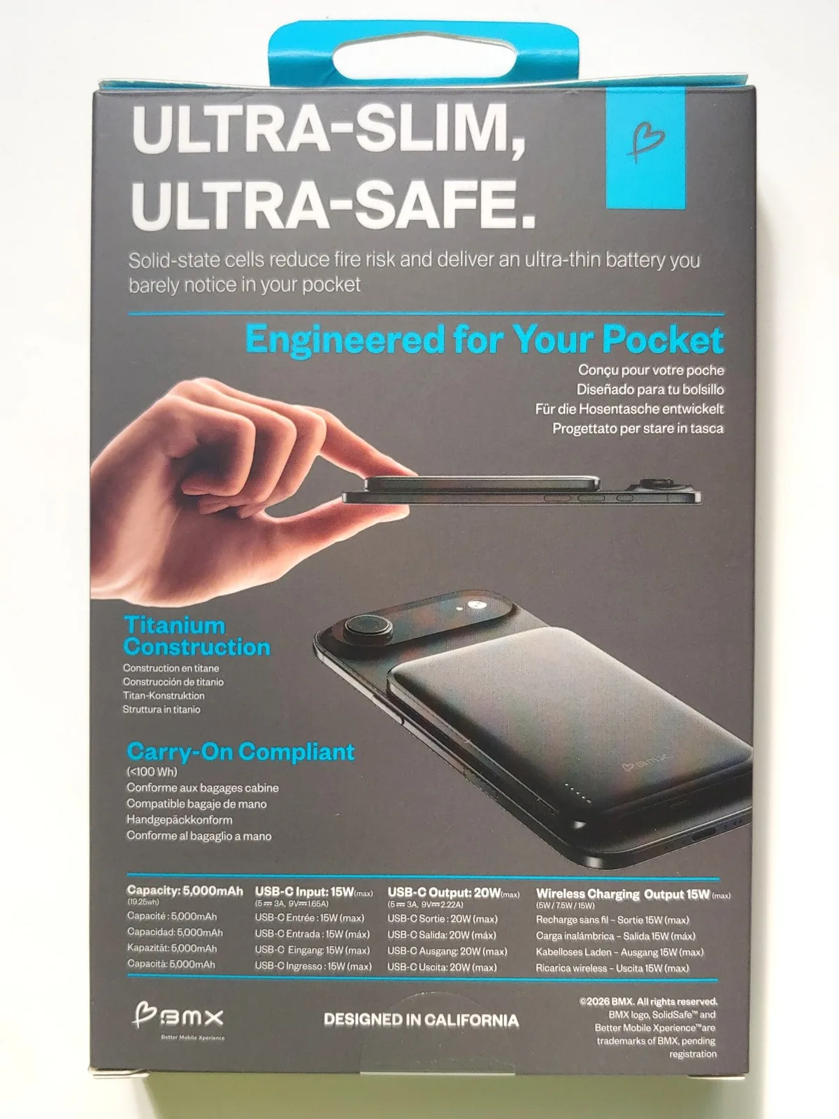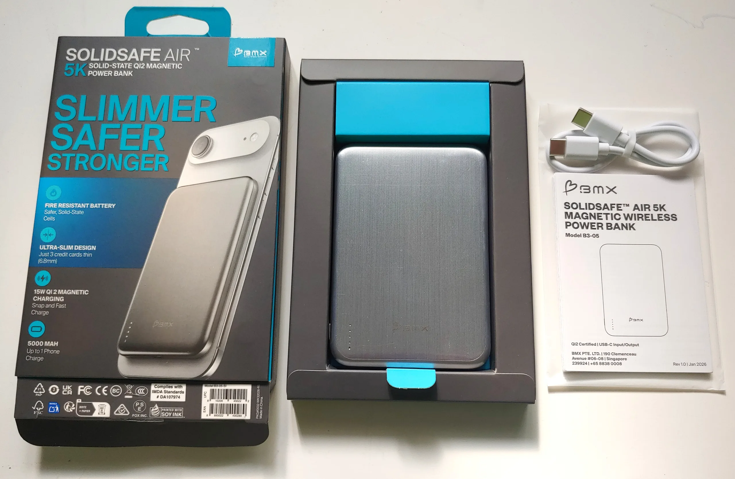 La banque d'alimentation BMX SolidSafe Air Titanium 5K est destinée aux utilisateurs qui ont besoin d'une autonomie supplémentaire dans un design fin qui prend en charge la recharge magnétique sans fil Qi2.