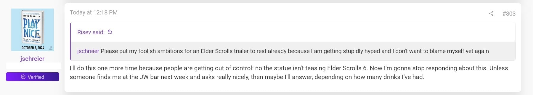 Schreier, qui sait peut-être précisément à quoi correspond la statue, s'est senti obligé de rétablir la vérité. Sur le forum ResetErail a déclaré : "Je vais le faire encore une fois parce que les gens deviennent incontrôlables : non, la statue n'est pas un teasing d'Elder Scrolls 6. Maintenant, je vais arrêter de répondre à ce sujet"