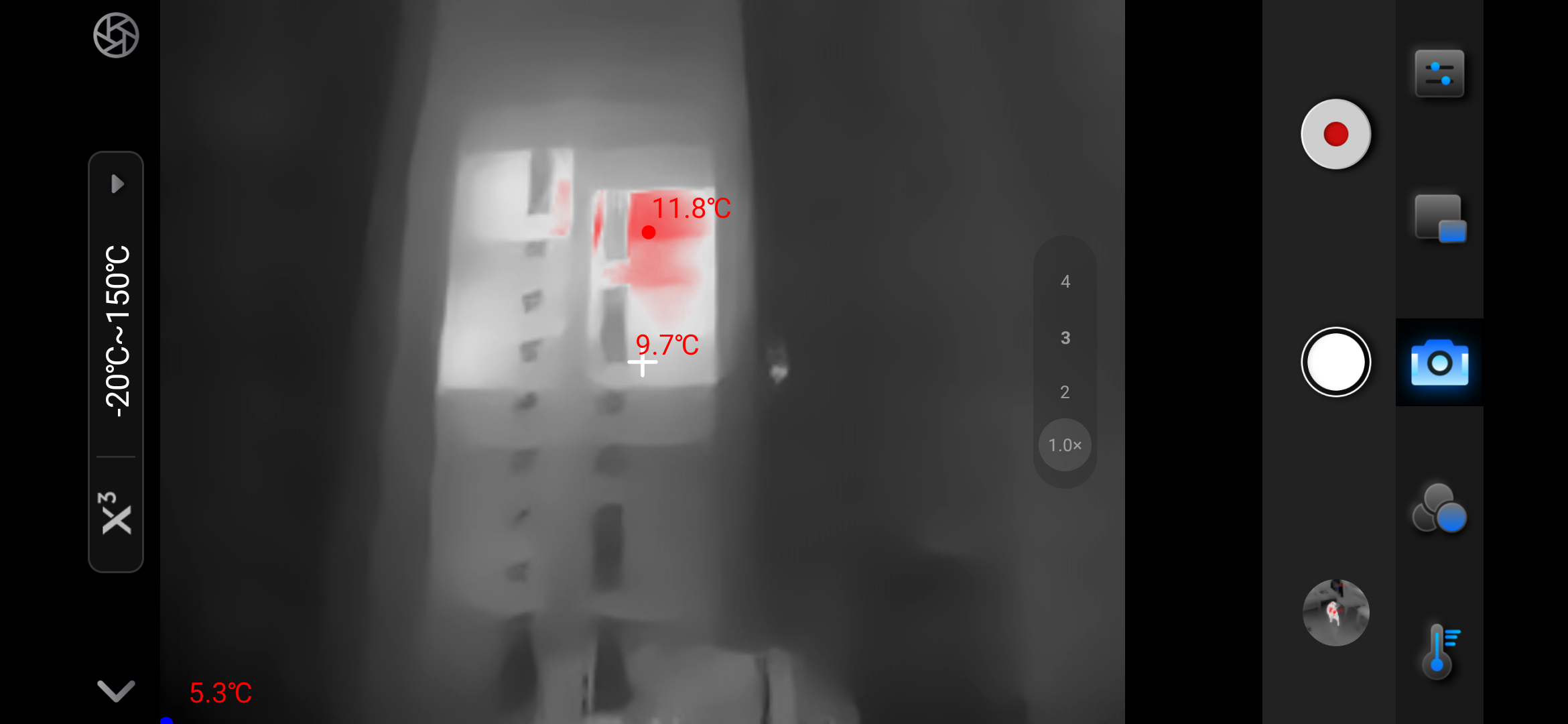 La mise au point fixe (infinie) est un avantage majeur pour le flux de travail. Contrairement à la mise au point manuelle du P3, le P1 fournit instantanément une image thermique claire, permettant des inspections rapides à une seule main sans avoir à ajuster une bague de mise au point. Bien qu'elle ne soit pas idéale pour ceux qui cherchent à s'approcher d'un sujet, cette fonction élimine en grande partie l'ambiguïté de la mise au point et contribue à accélérer l'ensemble du processus de test. Lors de la prise de vue de grands espaces, le P1 a fourni une quantité suffisante de détails pour son capteur à faible résolution et a été en mesure de détecter les différences de température à différentes distances. Comme nous l'avons mentionné, l'application propose également plusieurs outils pour personnaliser la mesure de la température du P1 sur un sujet, notamment l'outil rectangle.