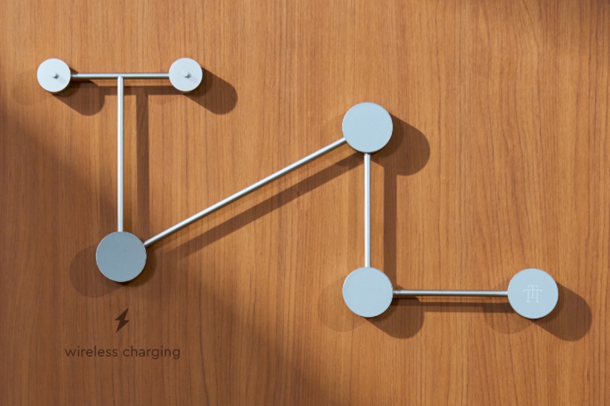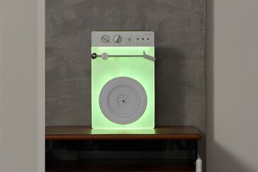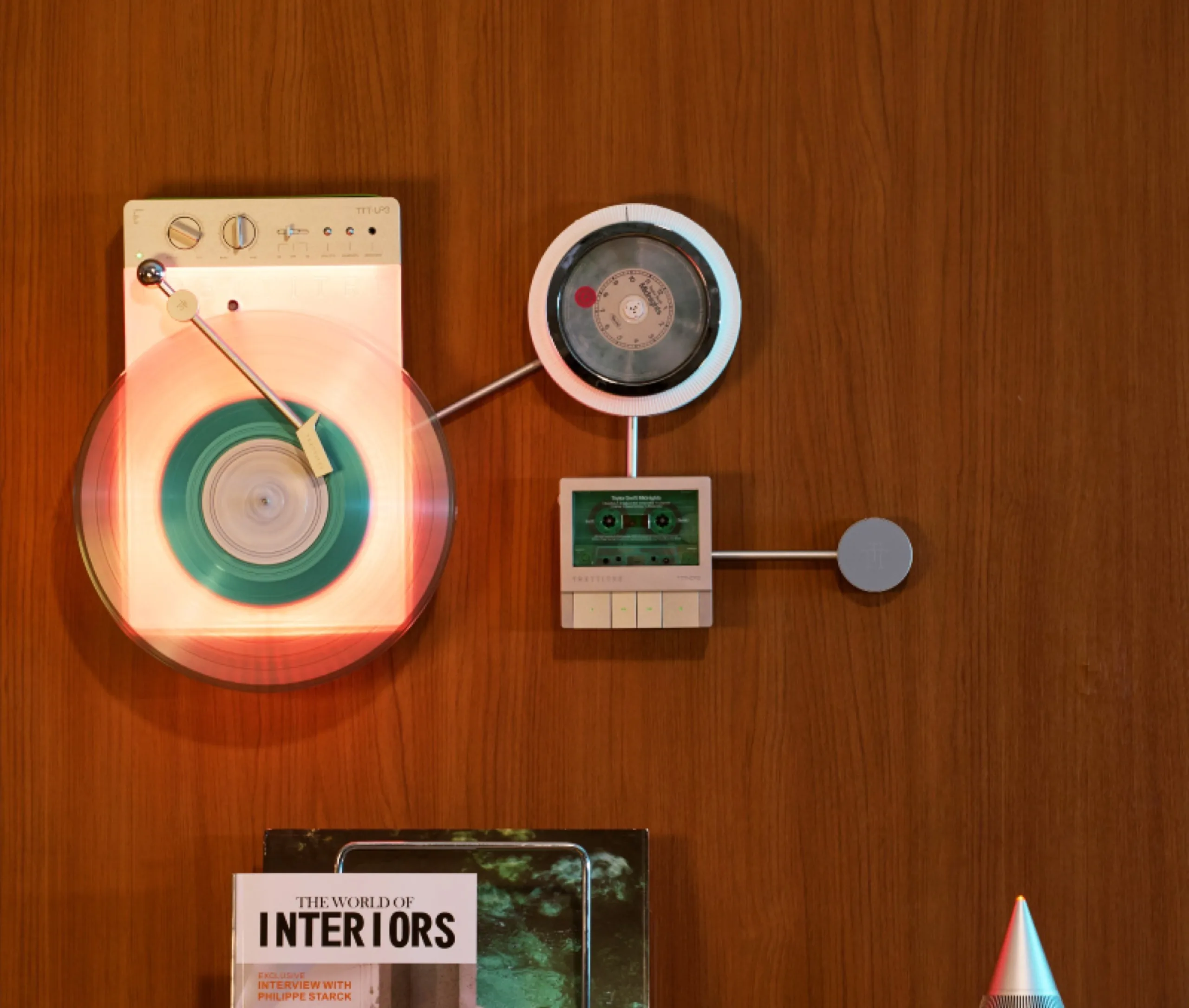 Ce support mural peut également accueillir de manière magnétique un smartphone tel que l'iPhone 17 ( Apple ). Le système se compose également de trois appareils de lecture qui peuvent lire des disques, des CD et des cassettes compactes. Le tourne-disque est le clou du design, car il est doté d'une surface éclairée qui met habilement en valeur les vinyles