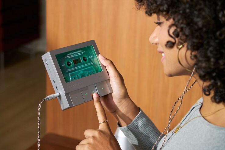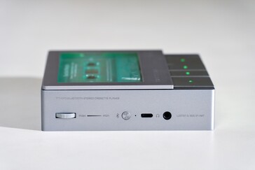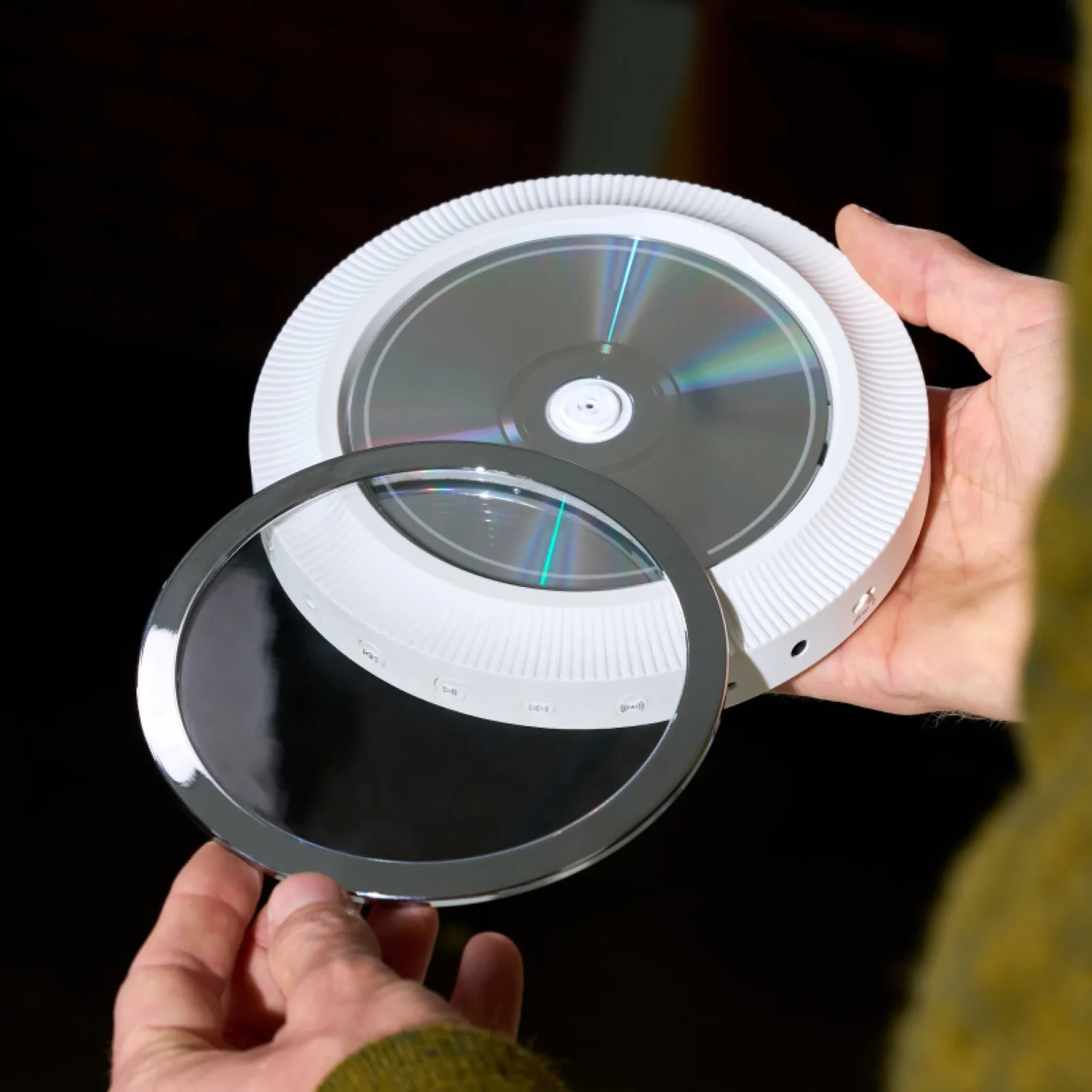 Le lecteur CD compact est également équipé d'une batterie. La façade ronde peut être tournée sur le côté pour changer de CD. Un petit écran OLED affiche les détails de la lecture et de la batterie. Comme le lecteur de cassettes, le lecteur de CD est chargé via USB-C, tous les composants ont un boîtier métallique de haute qualité et offrent à la fois Bluetooth et AUX