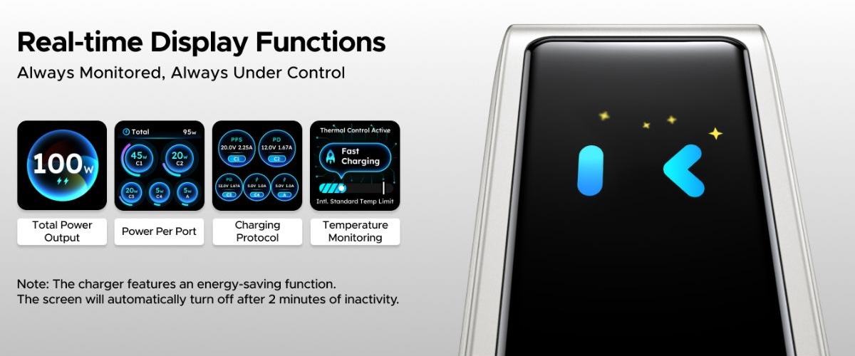 Le chargeur Nexode Pro 100W supporte une gamme de protocoles, y compris PD 3.0, QC 4.0 et PPS. Sur l'écran intégré, les utilisateurs peuvent voir des informations de charge en temps réel comme la distribution de puissance, le(s) protocole(s) de charge et la température. De plus, ce nouvel accessoire Ugreen a un design pliable qui le rend plus compact.