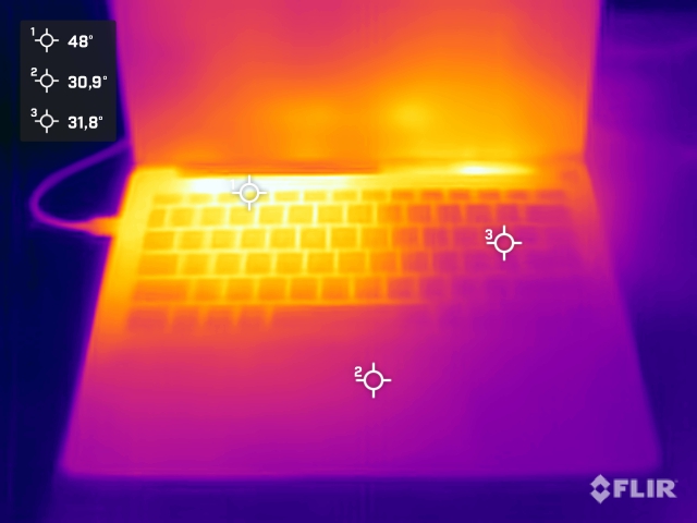 (-) La température maximale du côté supérieur est de 47.3 °C / 117 F, par rapport à la moyenne de 35.9 °C / 97 F, allant de 21.4 à 59 °C pour la classe Subnotebook.