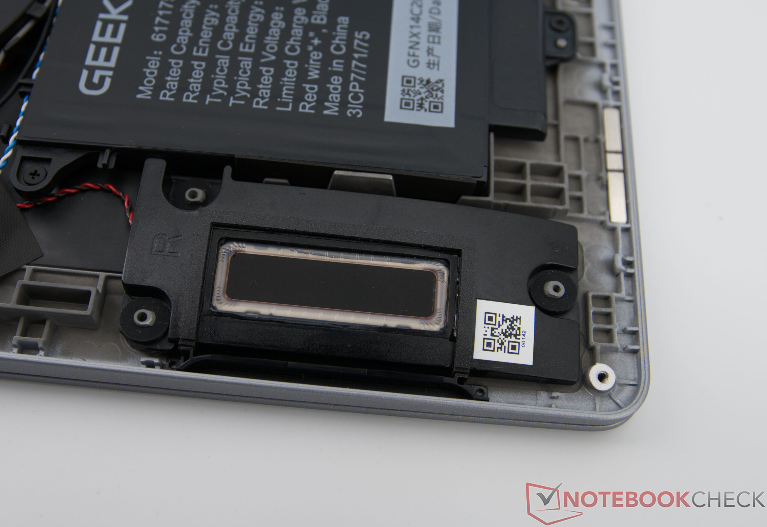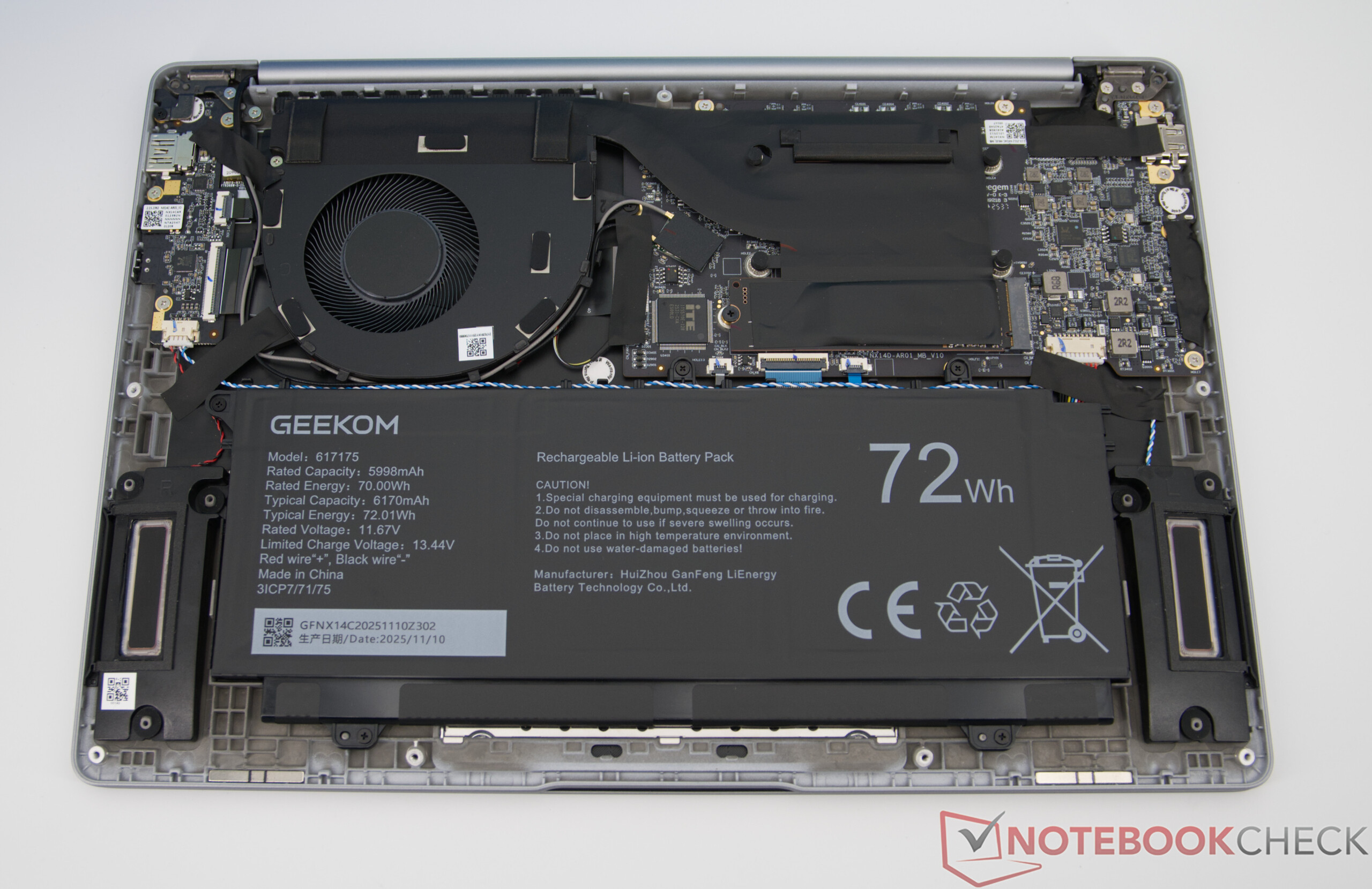 Le GeekBook X14 Pro s'appuie sur une batterie d'une capacité de 72 Wh, qui permet une autonomie décente en utilisation quotidienne mixte (bureautique, web et streaming) et permet de travailler en mobilité pendant plusieurs heures. En fonction de l'utilisation, une grande partie de la journée de travail peut être gérée sans prise de courant. Si la batterie est vide, une charge complète prend environ trois heures.
