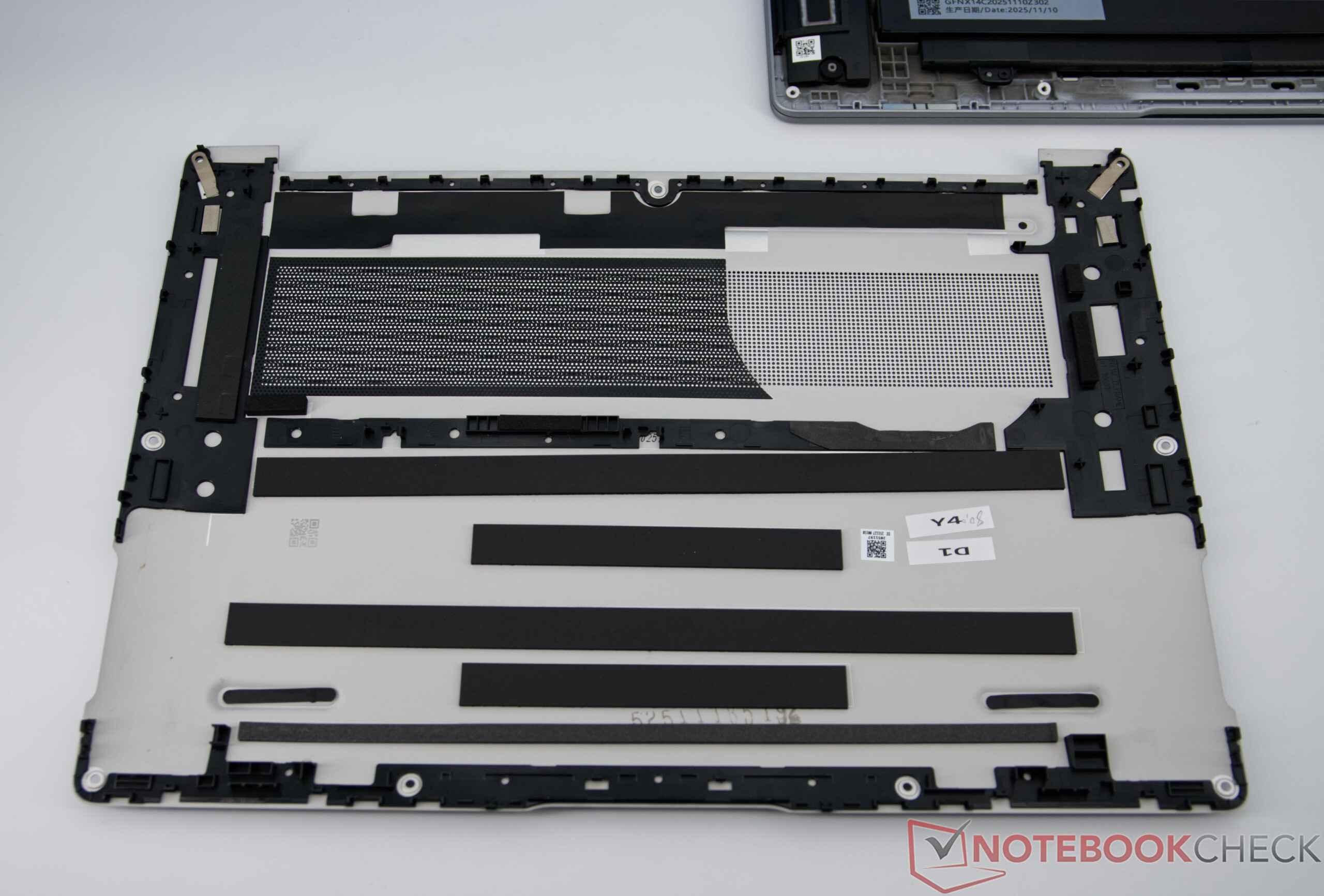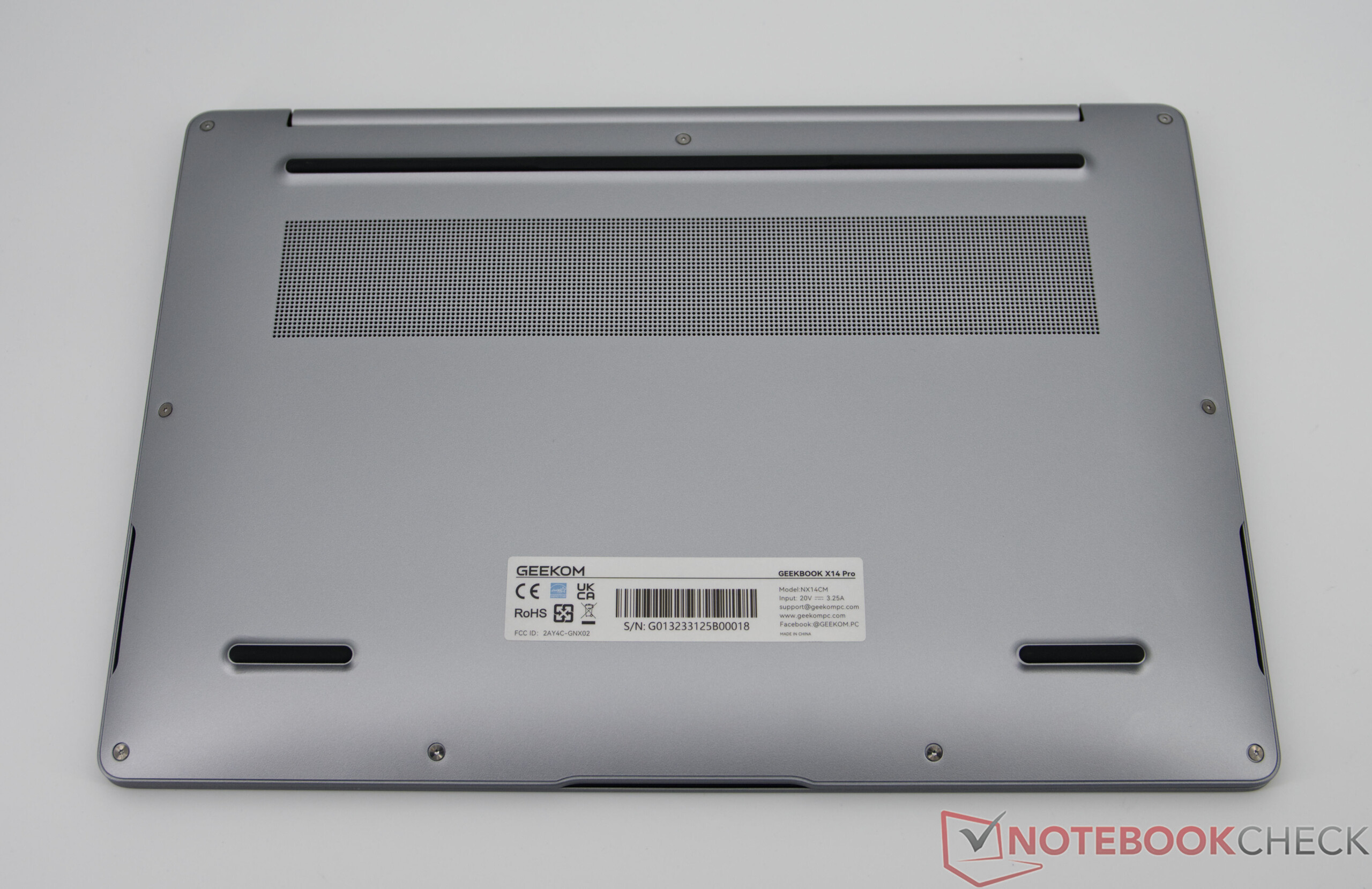 Le GeekBook X14 Pro impressionne par son châssis métallique particulièrement léger en alliage de magnésium, sa finition de haute qualité et son design épuré et contemporain. Malgré son faible poids, l'ordinateur portable semble stable, même si de légers points de flexion peuvent apparaître sous une forte pression - un compromis typique des appareils ultra-légers. Les charnières sont solides, adaptées à un usage quotidien et maintiennent bien l'écran en position.