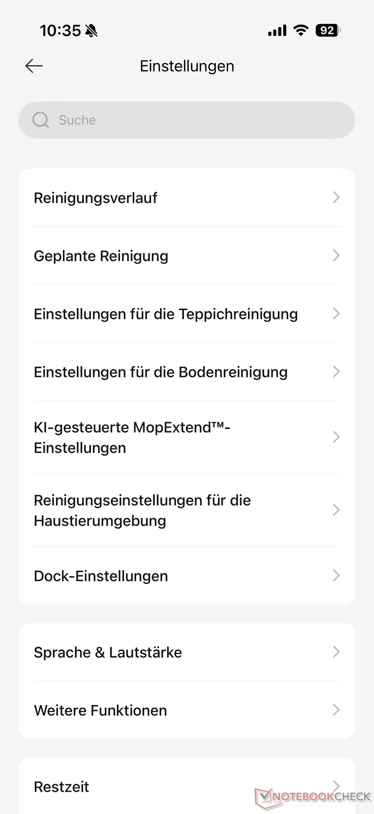 Outre l'historique du nettoyage, les mises à jour du micrologiciel et autres, le menu propose diverses options de réglage relatives au nettoyage des tapis, à MopExtend et à la station d'accueil. Le choix n'est pas aussi vaste que celui de certains modèles haut de gamme, mais il est tout à fait suffisant pour les besoins normaux. Une fonction pratique est la possibilité de charger l'appareil pendant les heures nocturnes moins chargées, par exemple pour bénéficier de tarifs d'électricité dynamiques.