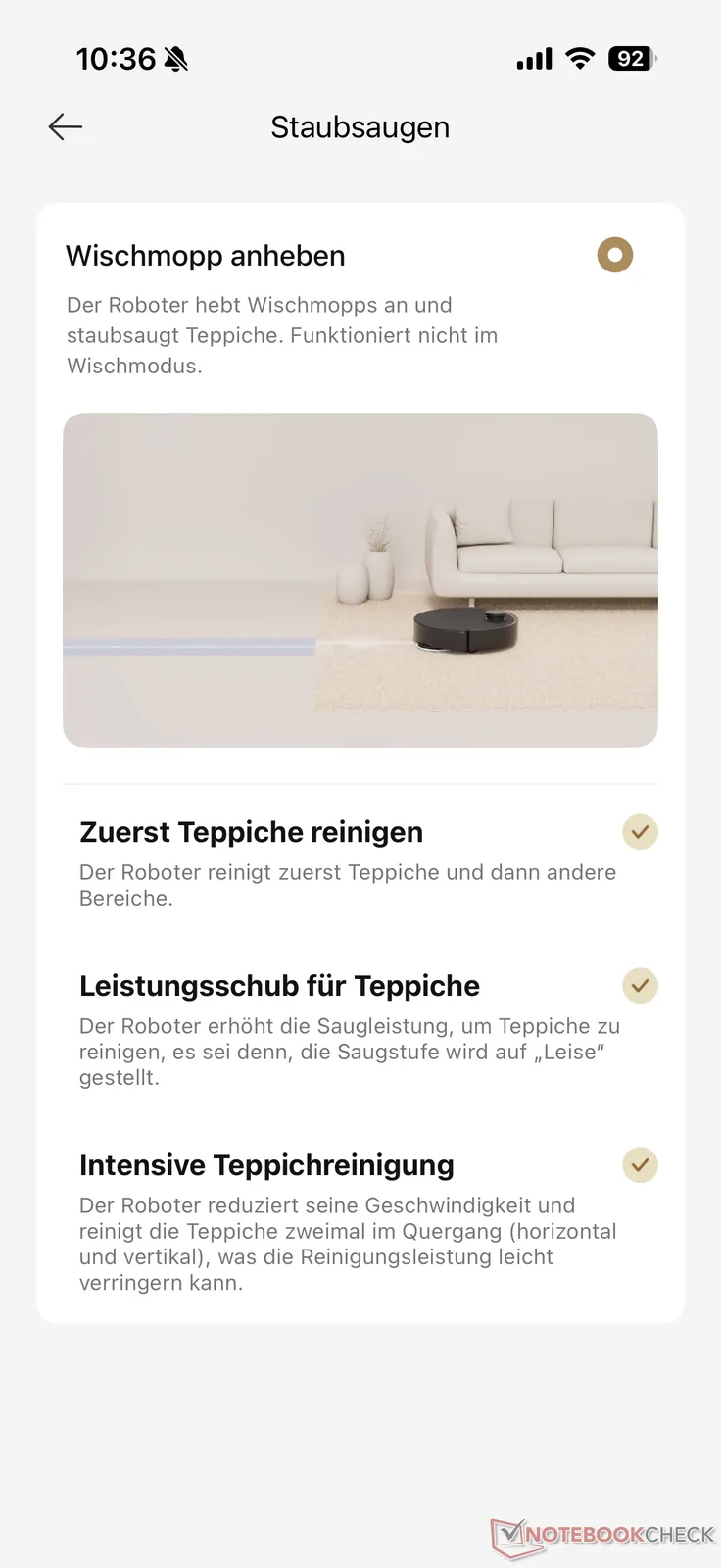 En revanche, avec des poils plus longs, le modèle (comme beaucoup d'autres) atteint parfois ses limites. Lors du test, quelques grains de sable sont restés sur un tapis testé malgré la puissance d'aspiration maximale, alors que le tapis était très propre en surface. Un autre problème est que les serpillières ne peuvent être soulevées que de 10 mm et ne peuvent pas être reposées. Il serait judicieux d'activer d'abord le nettoyage des tapis dans l'application avant de passer la serpillière sur les surfaces restantes.