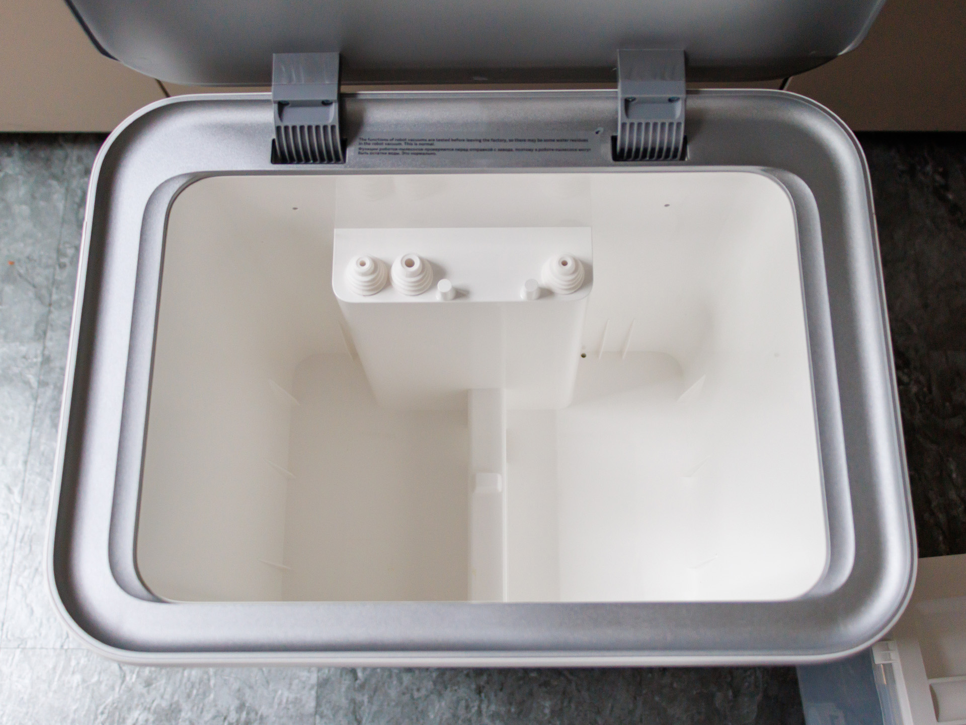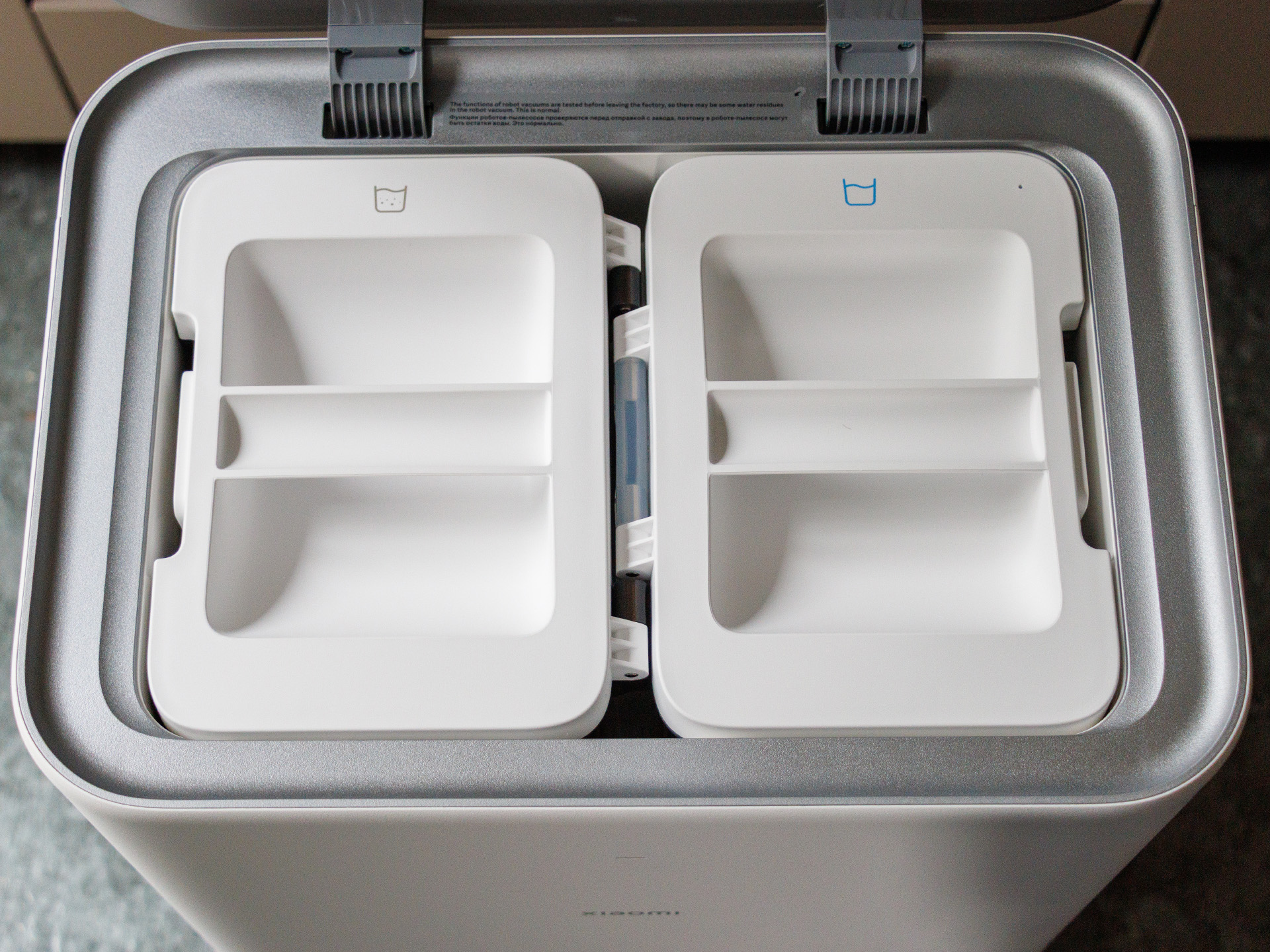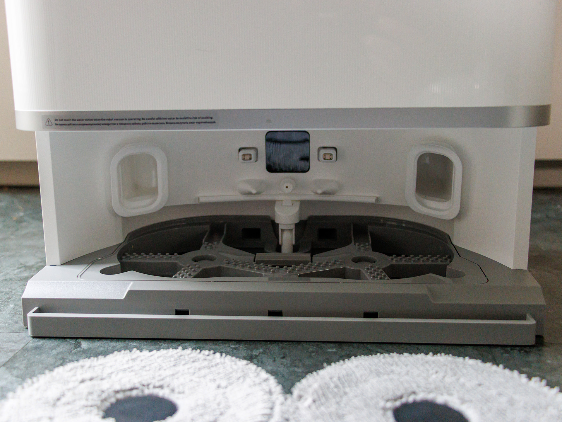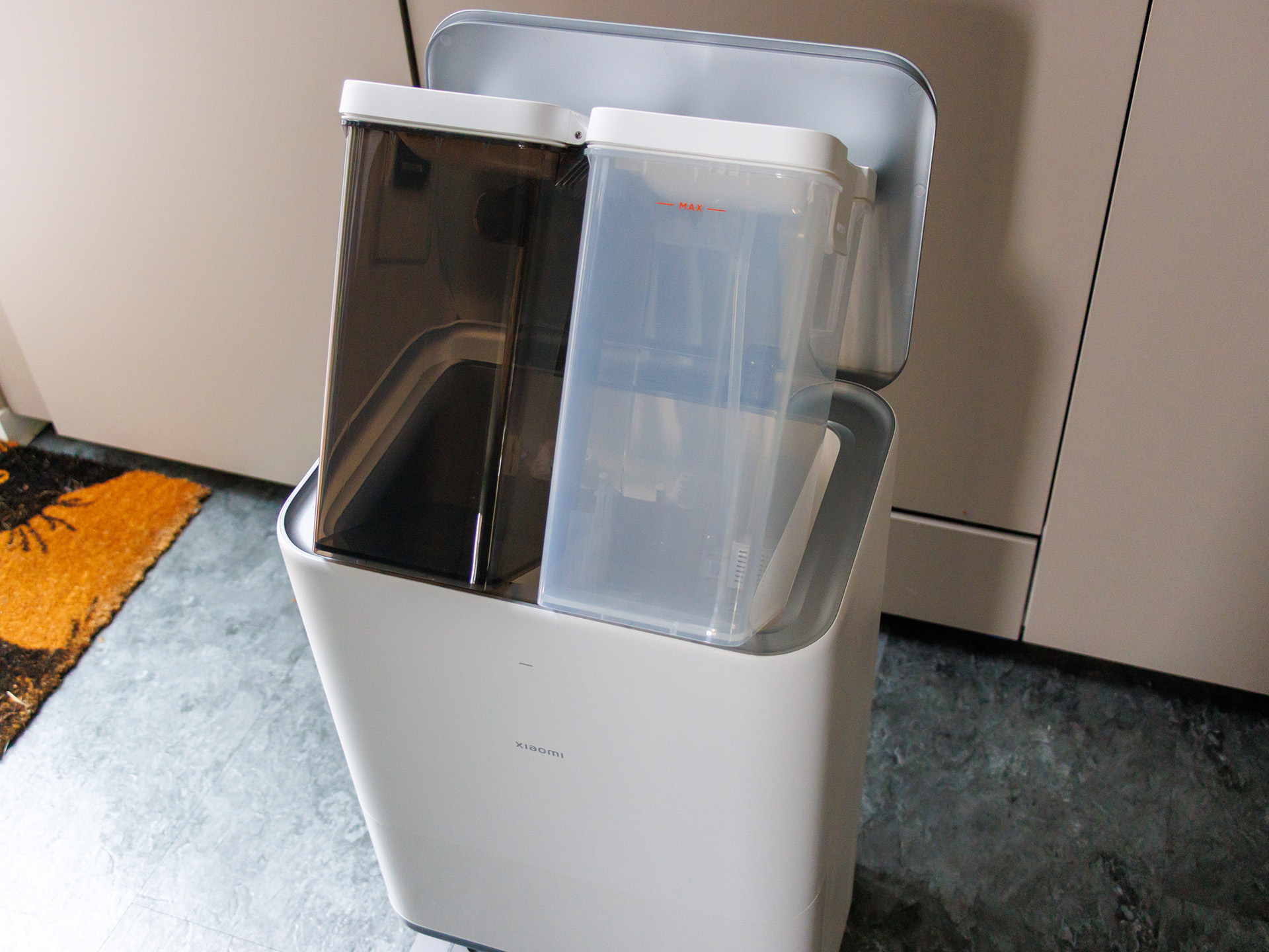 Le bac à poussière est assez petit, de sorte que l'aspirateur/serpillière robot doit retourner à sa station de charge plus fréquemment lorsqu'il s'agit de nettoyer de grandes surfaces. Les serpillières peuvent également y être nettoyées automatiquement avec de l'eau chaude à 80°C. Malheureusement, le Xiaomi Robot Vacuum 5 Pro n'a pas de réservoir de solution de nettoyage ; il utilise uniquement de l'eau. Nous avons trouvé que la quantité d'eau utilisée à la sortie de la boîte était assez faible, c'est pourquoi nous avons effectué la majeure partie du test au niveau 3. Un réservoir d'eau plein dans la station de charge était suffisant pour un peu plus de 240 mètres carrés.