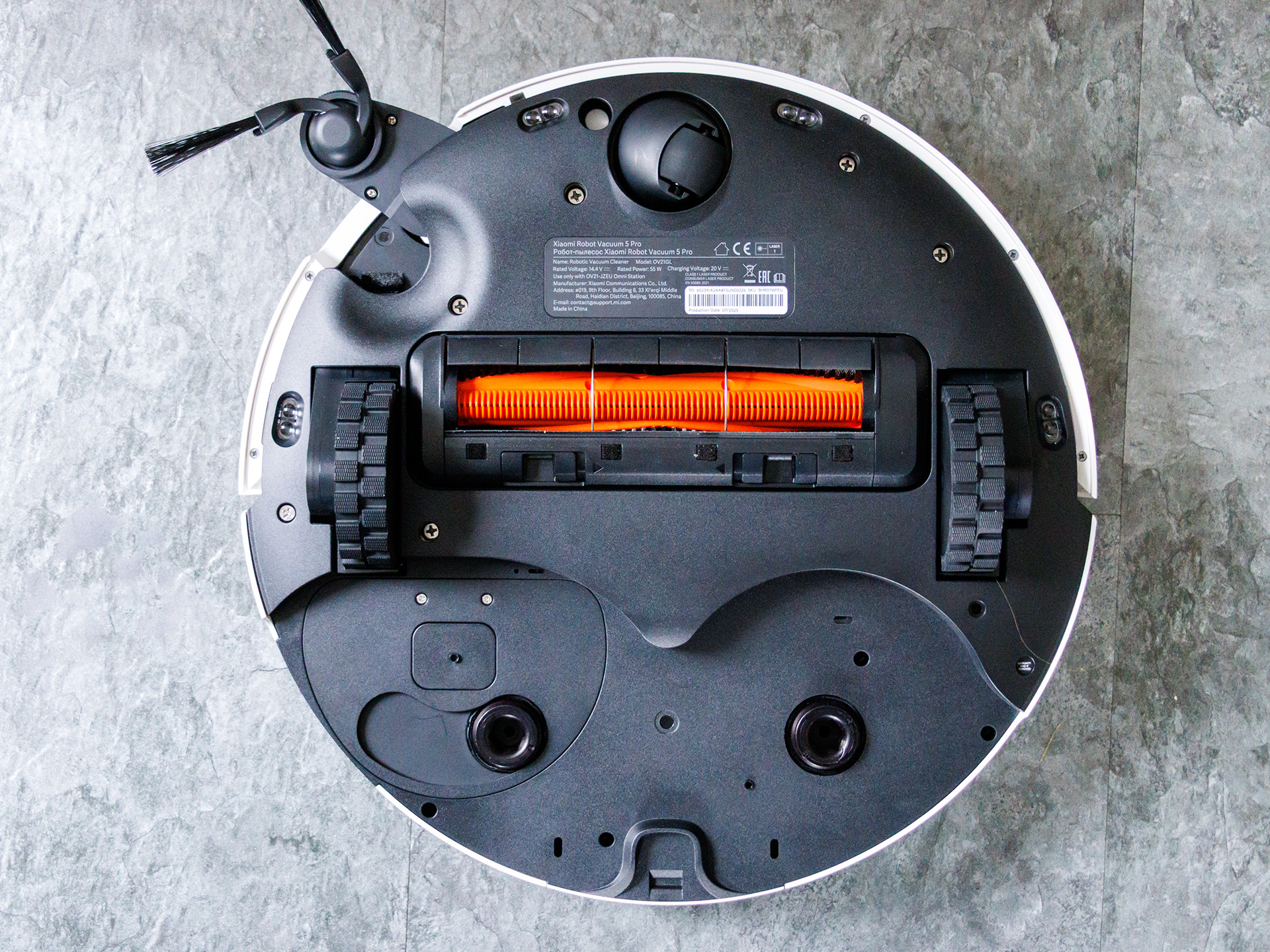 Le Xiaomi Robot Vacuum 5 Pro est un robot aspirateur et serpillière de milieu de gamme supérieur qui associe une puissance d'aspiration élevée (jusqu'à 20 000 Pa) à un système de navigation et de caméra avancé. La puissance d'aspiration élevée semble attrayante, mais des produits pouvant atteindre 30 000 Pa sont désormais disponibles. Au cœur de l'appareil se trouve un système de triple caméra alimenté par l'IA, associé à un radar laser dToF, conçu pour détecter avec précision les meubles, les câbles et autres obstacles, afin de garantir des itinéraires de nettoyage structurés et efficaces, même dans l'obscurité. En plus de la brosse principale caoutchoutée, le robot utilise une brosse latérale et un module de balayage extensible avec des balais rotatifs qui aspirent et balayent les sols et nettoient les bords en profondeur. La fonction anti-enchevêtrement des cheveux du Xiaomi Robot Vacuum 5 Pro fonctionne bien grâce à des brosses principales et latérales spéciales dotées de deux lames et d'un mécanisme de coupe qui hachent les cheveux et minimisent les enchevêtrements.