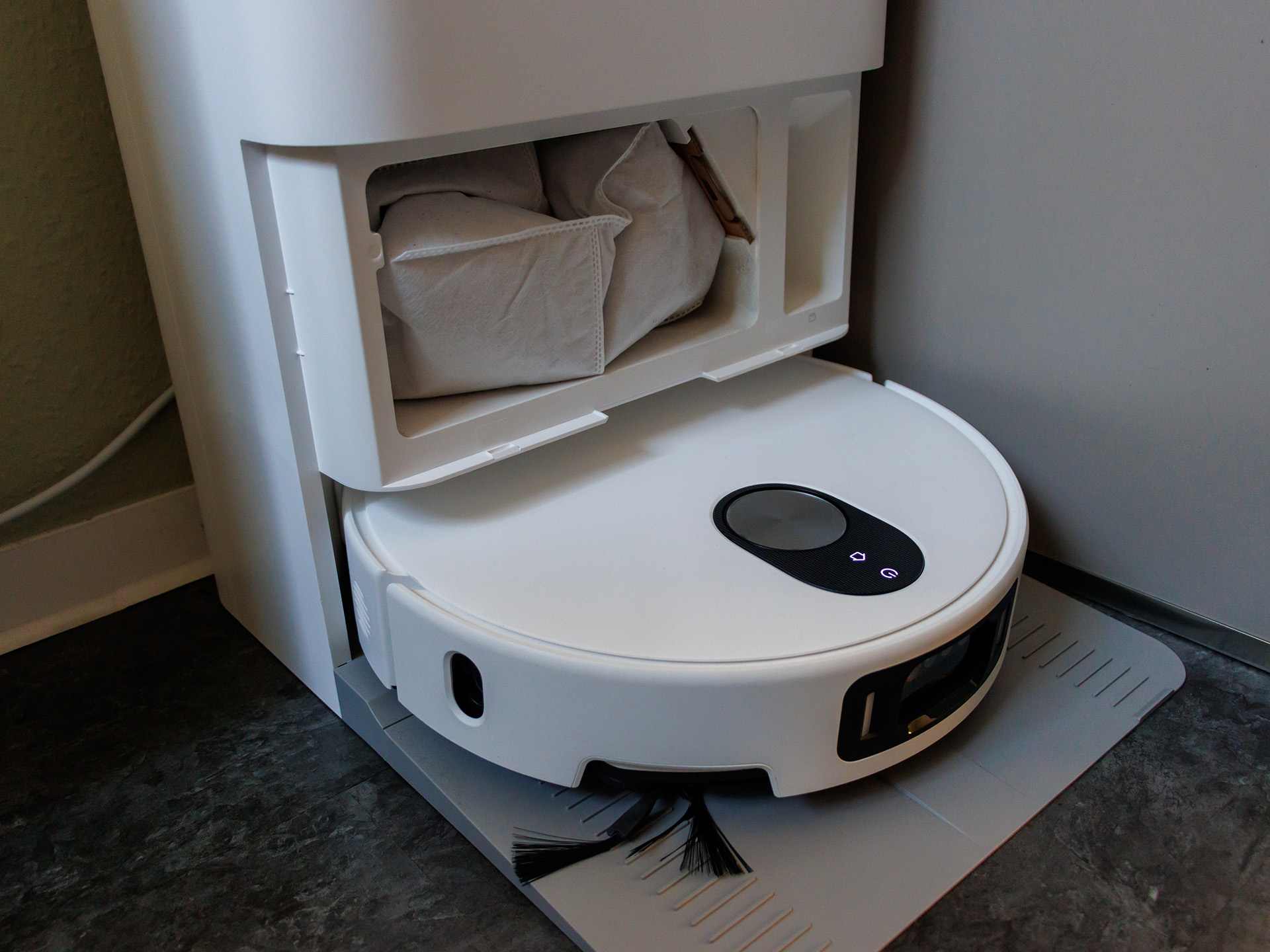Ses performances de nettoyage brillent sur les sols durs, éliminant en profondeur la poussière et les taches à l'aide de balais rotatifs à niveau d'eau variable qui couvrent jusqu'à 240 m² par réservoir ; les bords sont efficacement nettoyés, mais les tapis nécessitent le niveau de puissance maximal et plusieurs passages, car le mode standard a tendance à laisser des résidus derrière lui. La station tout-en-un vide automatiquement le petit bac à poussière, lave les mops à 80 °C et les sèche, réduisant ainsi l'entretien et les odeurs, mais sans produits de nettoyage, elle se limite à l'eau claire.