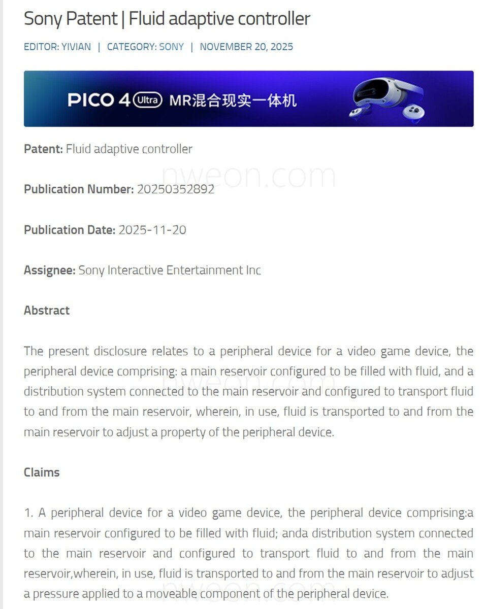 Les documents repérés sur les forums ResetEra ont une date de publication fixée au 20 novembre. Les accessoires qui pourraient présenter la technologie Fluid Adaptive pourraient ressembler au DualSense ou au contrôleur VR2 Sense. Chaque dispositif comporterait un réservoir central de liquide, avec la possibilité de s'écouler vers des chambres secondaires. Les compartiments plus petits sont directement adjacents aux sticks analogiques ou aux boutons faciaux.