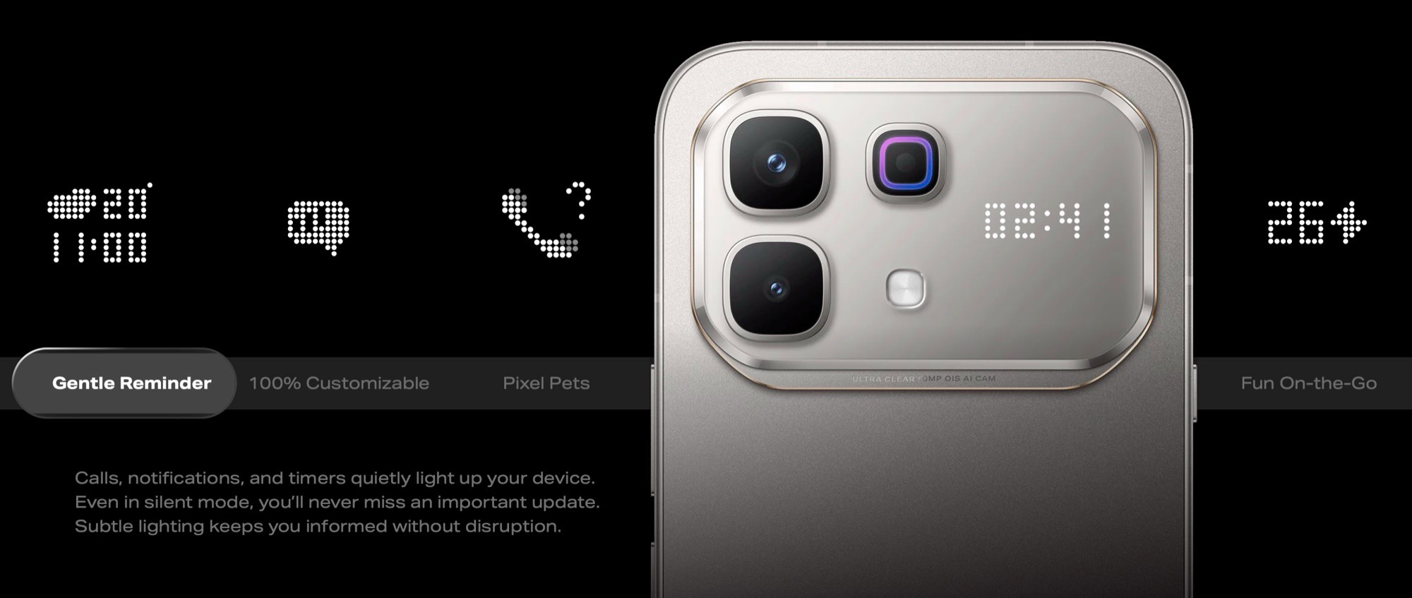 Le boîtier comporte également quelques éléments uniques. Tout d'abord, un bouton d'action programmable qui peut lancer un assistant IA ou ouvrir l'appli appareil photo, entre autres. Deuxièmement, un écran à matrice de points dans le module de la caméra qui peut indiquer les messages entrants, montrer l'heure ou afficher un animal de compagnie virtuel. Enfin, un "moniteur de santé" - ce qui ressemble à un bouton d'obturateur d'appareil photo est en fait un capteur de fréquence cardiaque et de SpO2. Pour prendre une mesure, il suffit de placer son doigt sur ce capteur pendant 30 secondes