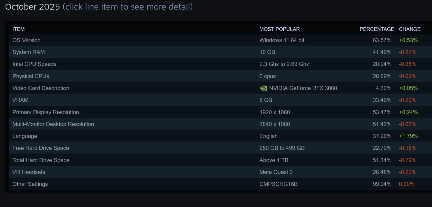 La plupart des analystes comparent les prouesses graphiques du PC compact à une RX 7600moins puissante, ou un cran en dessous de la RTX 4060. Le GPU leader de l'enquête est la RTX 3060, suivie de près par la RTX 4060 de bureau et la RTX 4060 mobile. De nombreux joueurs utilisent encore des composants plus anciens, comme la GTX 1650.