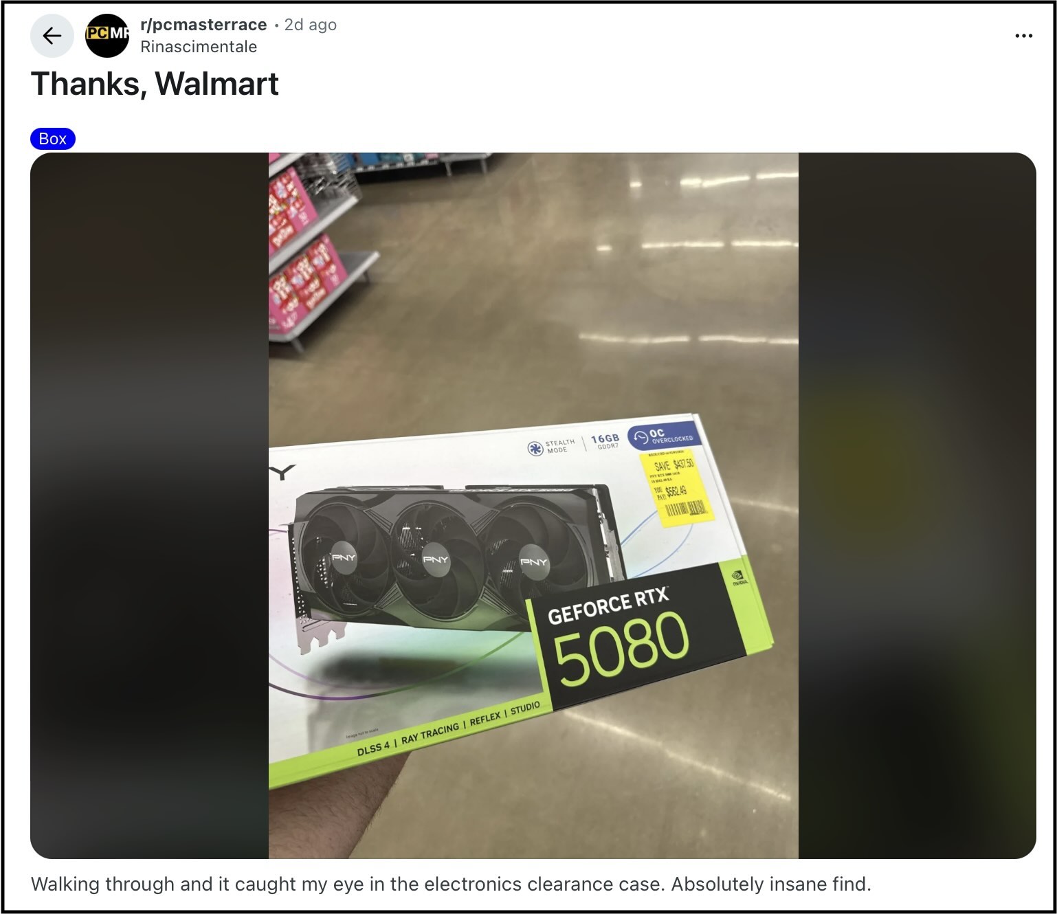 Toutefois, comme nous l'avons signalé précédemment, un grand nombre de passionnés et de joueurs ont réussi à trouver des bonnes affaires sur du matériel de jeu, grâce aux friperies et aux soldes. L'un de ces joueurs a apparemment réussi à se procurer une carte PNY RTX 5080 à triple ventilateur pour seulement 562 $ dans son Walmart local, qu'il a trouvé dans l'allée des soldes.