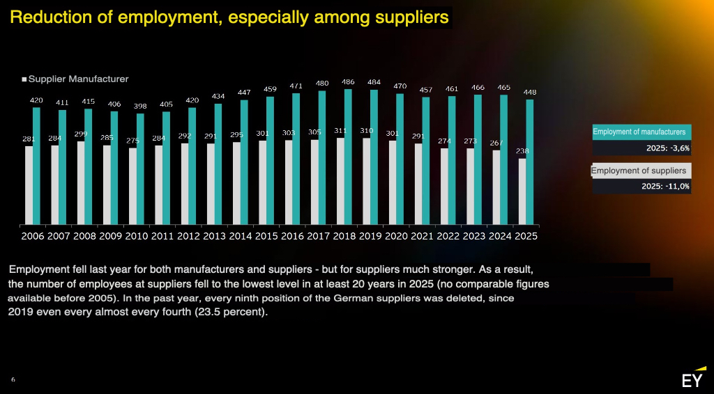 Selon l'analyse, cette faiblesse continue de la demande affecte directement les sites de production automobile établis en Allemagne. Les constructeurs automobiles et leurs fournisseurs ont terminé l'année 2025 avec des ventes en baisse de 1,6 %. Toutefois, les conséquences pour la main-d'œuvre sont encore plus graves. L'industrie automobile a supprimé 6,2 % des emplois, ramenant l'emploi total à son niveau le plus bas depuis 14 ans, soit environ 725 000 salariés.