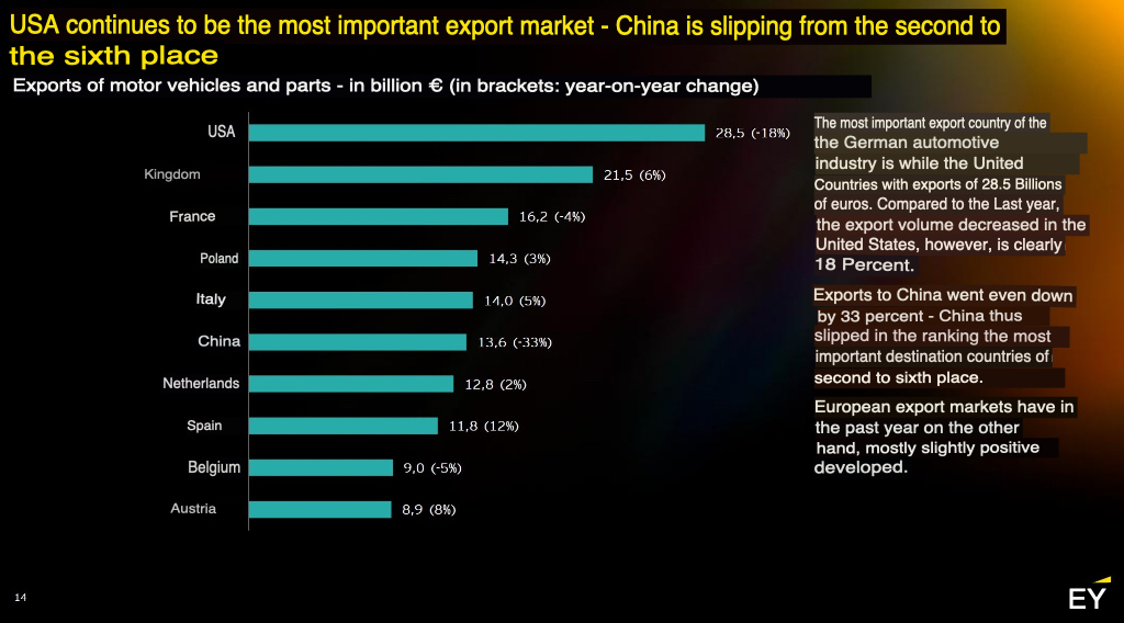 Les concurrents asiatiques poursuivent désormais une stratégie d'exportation ciblée, ce qui a pour effet d'inverser la balance commerciale habituelle. Dans le même temps, les ventes de voitures allemandes sur le marché américain sont en chute libre. Les indicateurs sectoriels d'EY décrivent en détail ce déclin constant.