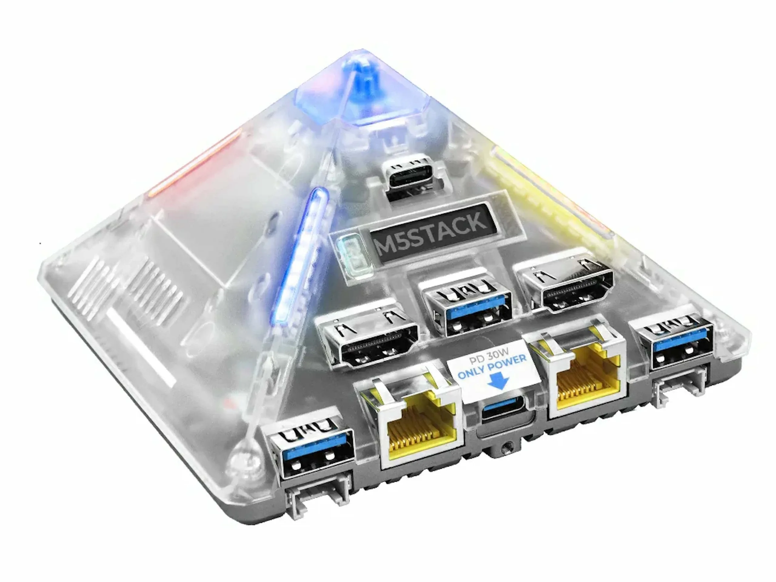 Les photos du produit montrent également plusieurs diodes électroluminescentes. Plus précisément, l'AI Pyramid Computing Box dispose de 48 LED RVB sur les bords supérieurs et sur le dessus. Le mini PC est également refroidi activement et est livré avec un système d'exploitation préinstallé. Enfin, un haut-parleur et un microphone sont intégrés pour la saisie vocale.