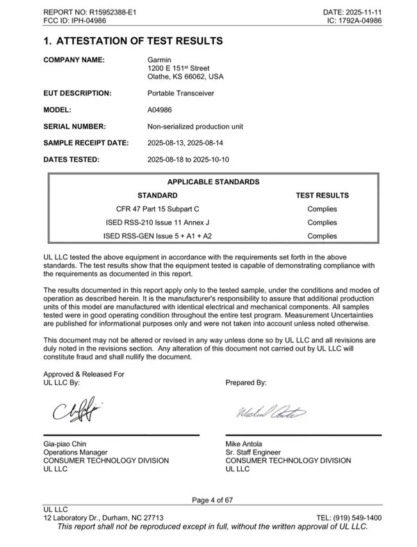 En outre, la FCC mentionne la prise en charge des radars 60 GHz. Par conséquent, nous pensons qu'il s'agit d'un nouvel appareil de la marque Approach ou Varia. On ne sait pas encore si l'A04986 est un appareil de poignet ou un moniteur portable comme l'Approach R10 (407,49 $ actuellement - remis à neuf sur Amazon). Quoi qu'il en soit, l'expiration de l'accord de confidentialité entre Garmin et la FCC en mai laisse présager un lancement au printemps 2026.