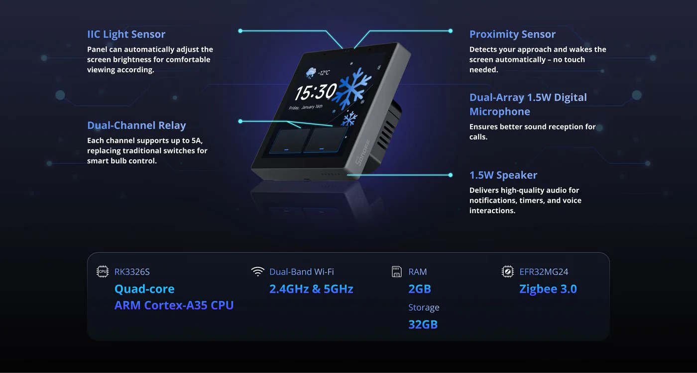 Le matériel comprend deux microphones pour les commandes vocales. Le SoC RK3326-S est associé à 2 Go de RAM et 32 Go de stockage interne. L'écran tactile de 3,95 pouces a une résolution de 480 × 480 pixels. Sa luminosité peut également être contrôlée à l'aide d'un capteur de luminosité, de sorte qu'il reste facile à lire pendant la journée et qu'il n'est pas gênant la nuit. Le NSPanel Pro Gen 2 peut détecter si une personne se tient devant l'appareil. Un haut-parleur est intégré. Le NSPanel Pro Gen 2 est également capable d'afficher des images provenant de caméras de surveillance. Le modèle est actuellement disponible à la commande pour environ 120 dollars, et les livraisons devraient débuter en juin.