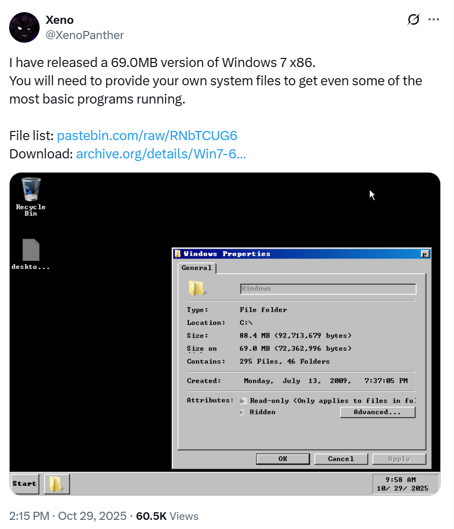Le passionné de Windows @XenoPanther a réussi à créer et à démarrer une version fortement dépouillée de Windows 7 qui n'occupe que 69 mégaoctets d'espace disque. Le projet, partagé en ligne le 29 octobredémontre à quel point il est possible de réduire la taille du système d'exploitation tout en réussissant une séquence de démarrage réussie.