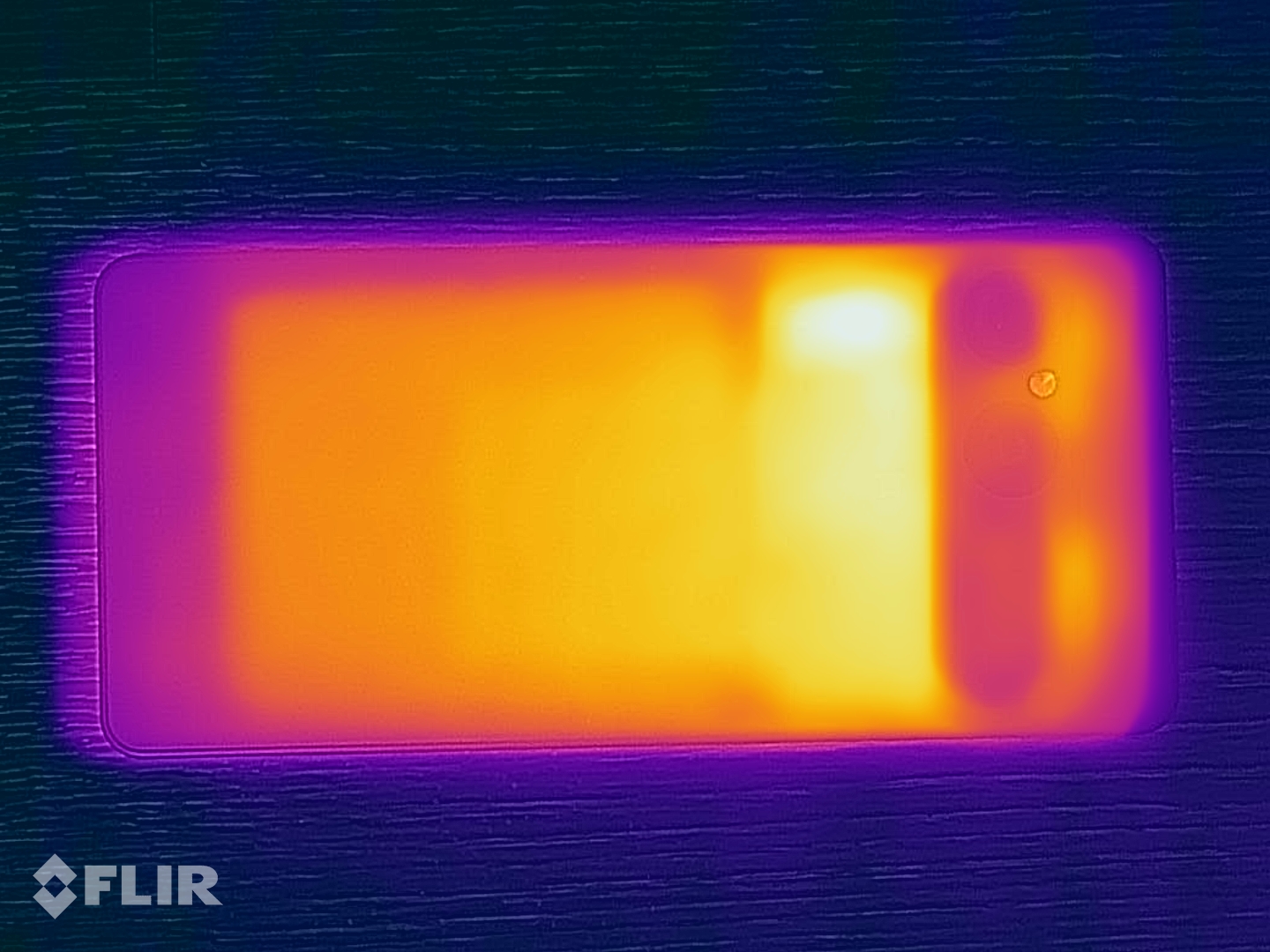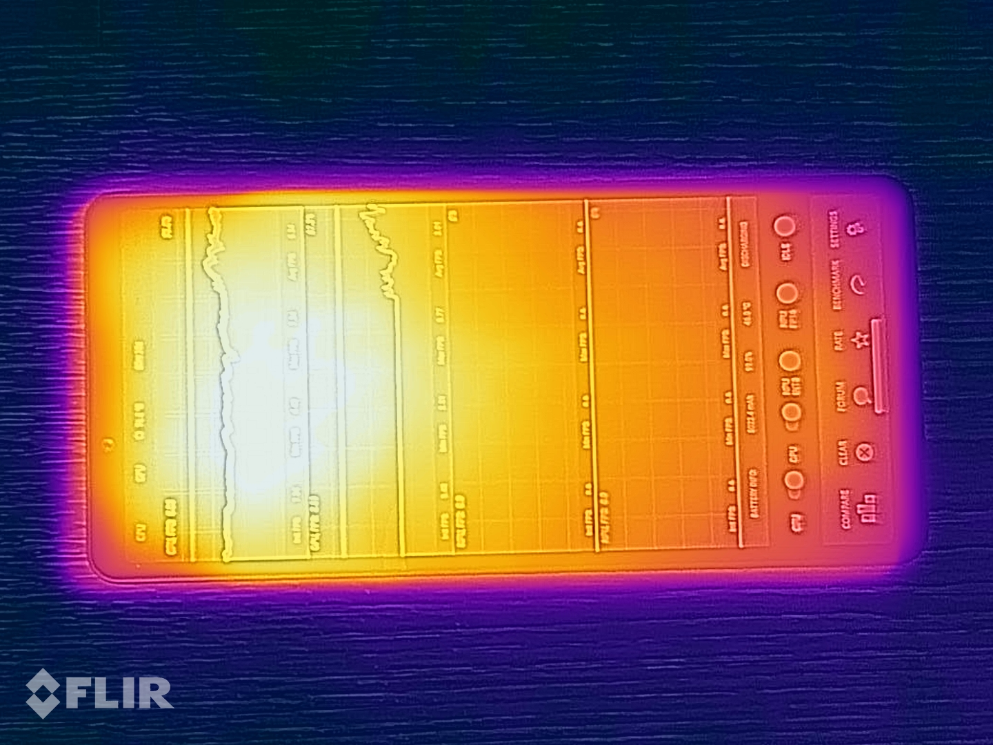 (±) La température maximale du côté supérieur est de 43.8 °C / 111 F, par rapport à la moyenne de 35.2 °C / 95 F, allant de 21.9 à 247 °C pour la classe Smartphone.