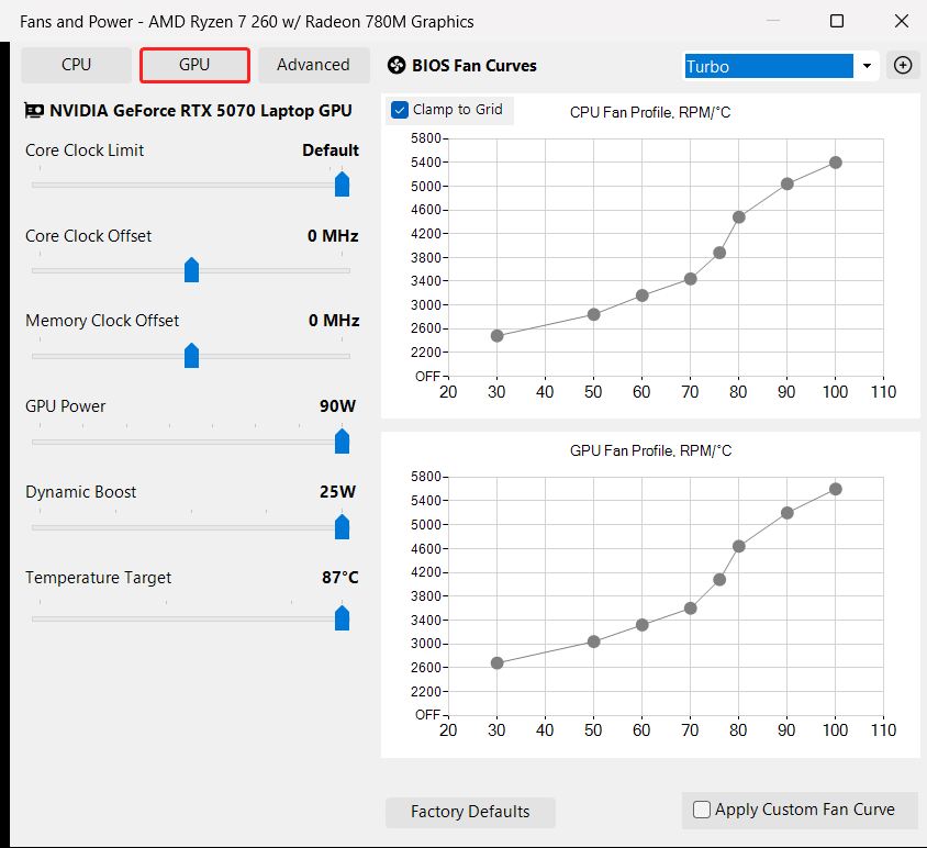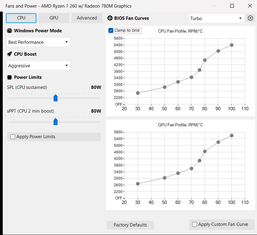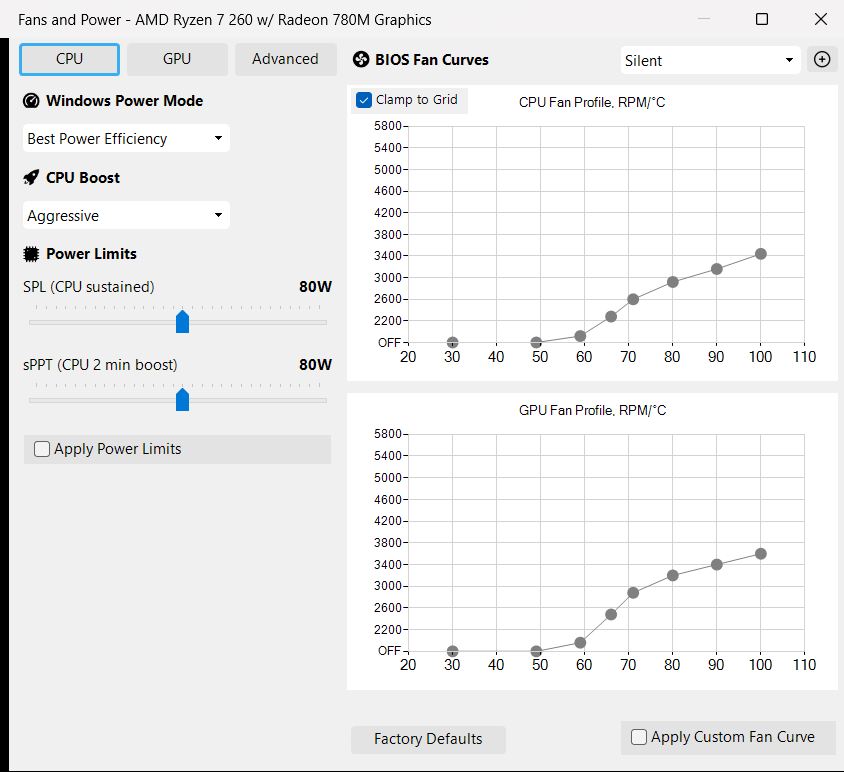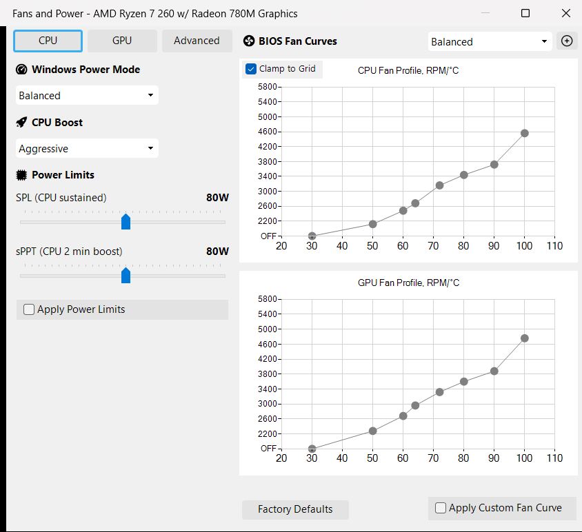 Vous pouvez changer de profil de performance, définir des courbes de ventilateur manuelles et des limites de puissance pour chaque profil, et tout gérer confortablement. Ces limites sont lues à partir du BIOS, ce qui signifie que tous les changements restent dans les limites des spécifications officielles.
