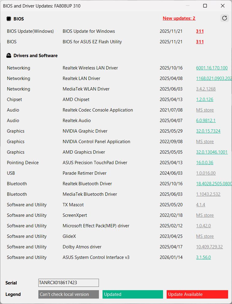 - L'outil affiche également les mises à jour disponibles et les versions installées des différents pilotes - une fonctionnalité qui nécessiterait autrement MyAsus. À cet égard, G-Helper combine efficacement les rôles d'Armoury Crate et de MyAsus en une seule application.