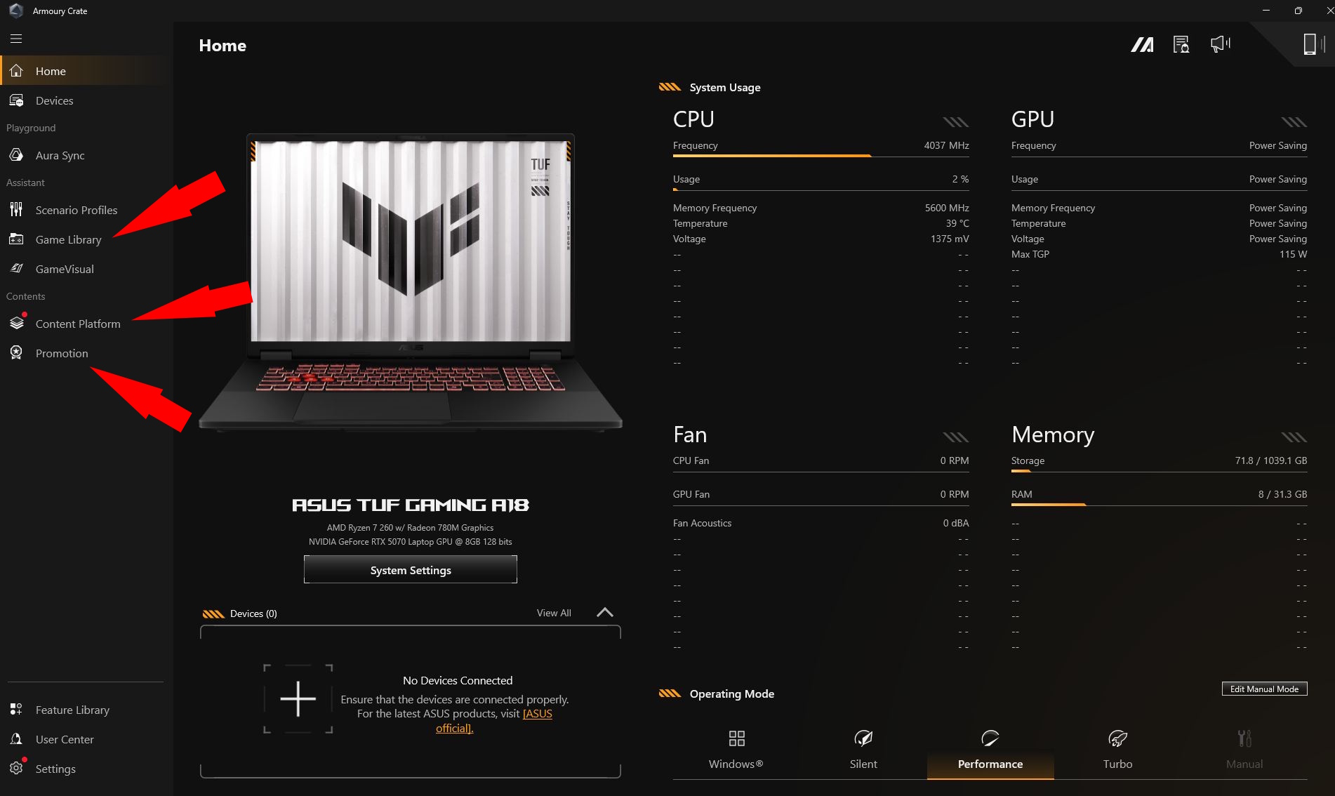 Armoury Crate est lent à démarrer, ne se charge parfois pas du tout, et semble gonflé et léthargique. Son interface est encombrée d'onglets pour une bibliothèque de jeux, des plateformes de contenu et, surtout, du contenu promotionnel. De plus, il génère un nombre excessif de processus Asus en arrière-plan.