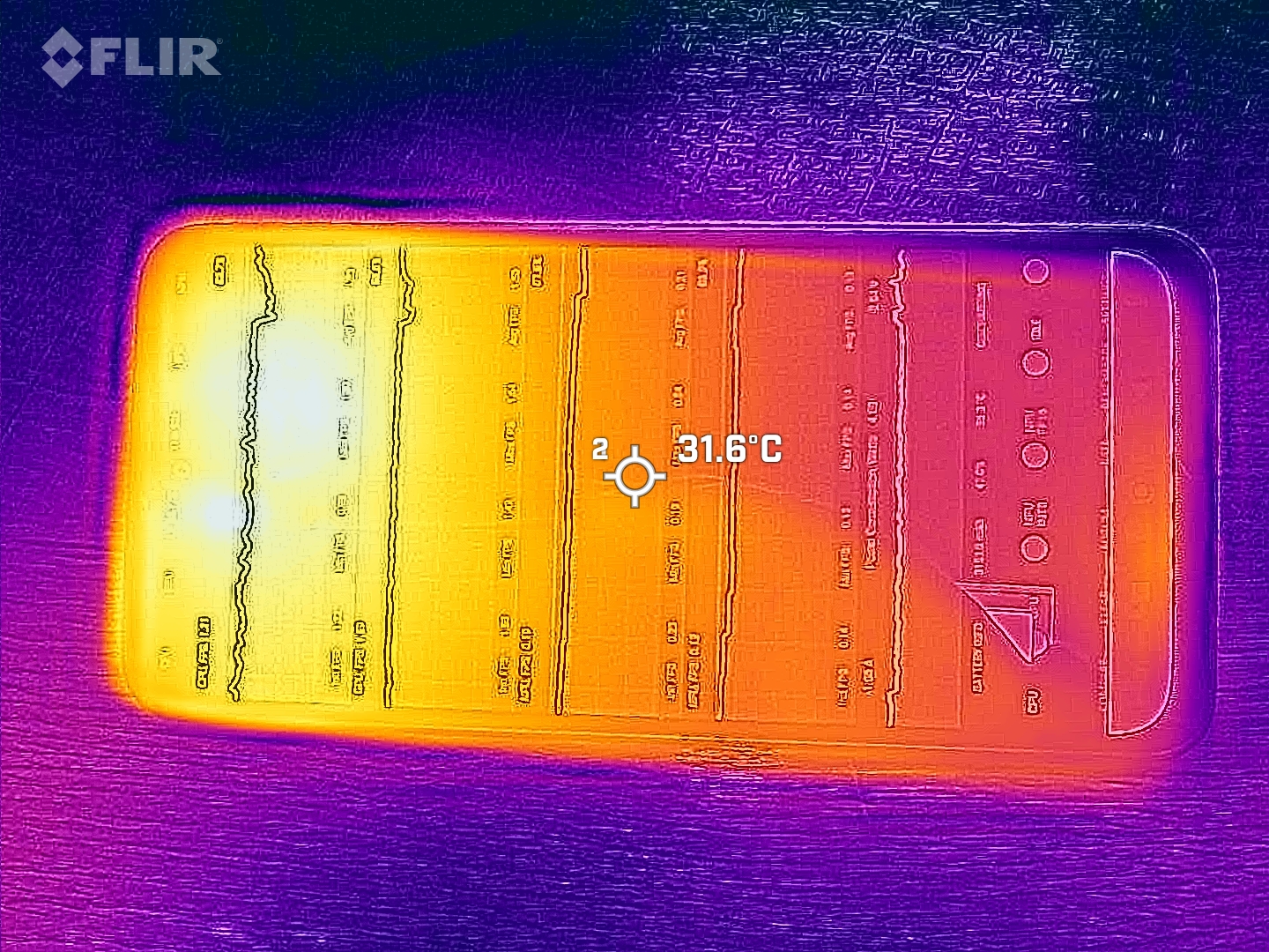 (±) La température maximale du côté supérieur est de 40 °C / 104 F, par rapport à la moyenne de 35.2 °C / 95 F, allant de 21.9 à 247 °C pour la classe Smartphone.