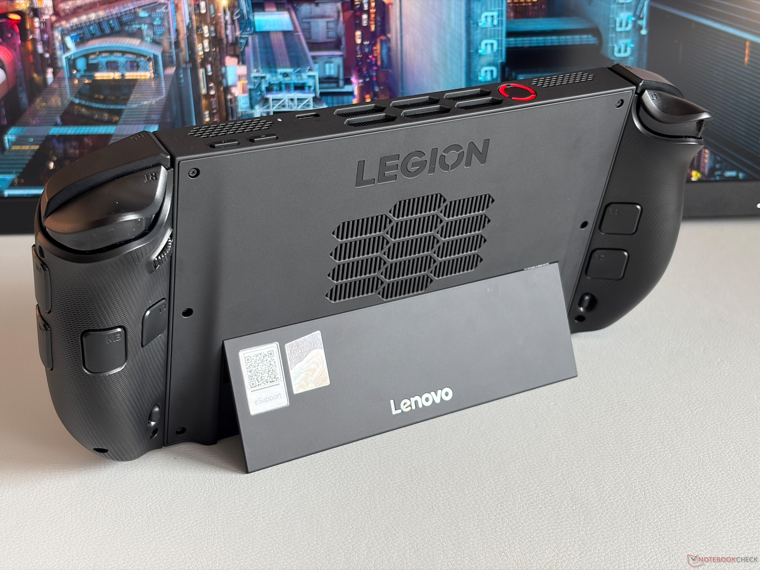 Le design général du Legion Go 2 reste dans la lignée de son prédécesseur. Le châssis en plastique noir est en grande partie lisse et donne l'impression d'être de haute qualité, avec des surfaces texturées uniquement à l'arrière des deux poignées pour améliorer la prise en main. Les poignées peuvent toujours être détachées, ce qui permet de poser l'unité centrale avec l'écran et le matériel interne sur une table, par exemple. La béquille intégrée reste relativement fine, mais elle n'est plus aussi facile à plier que sur le modèle précédent.