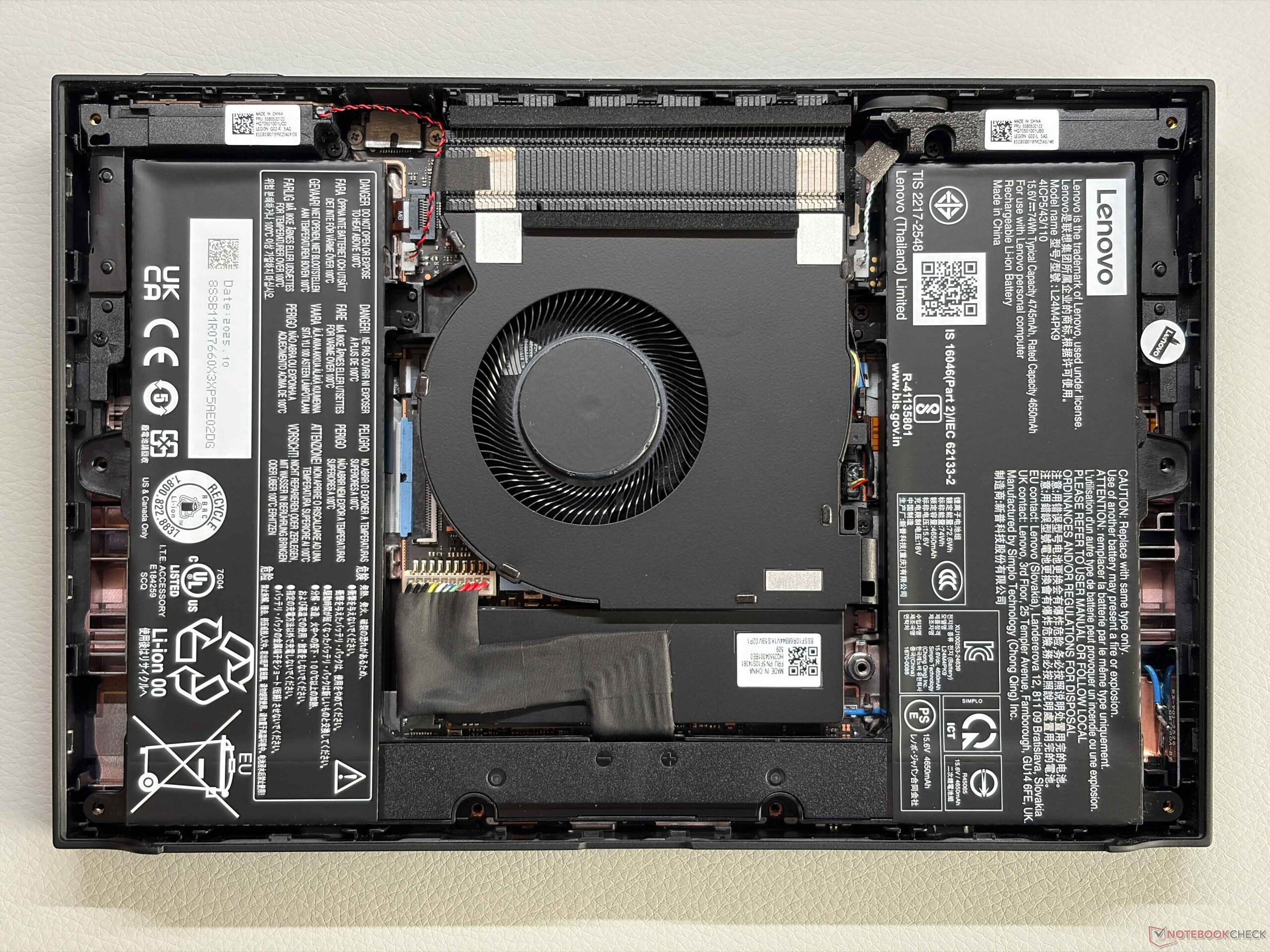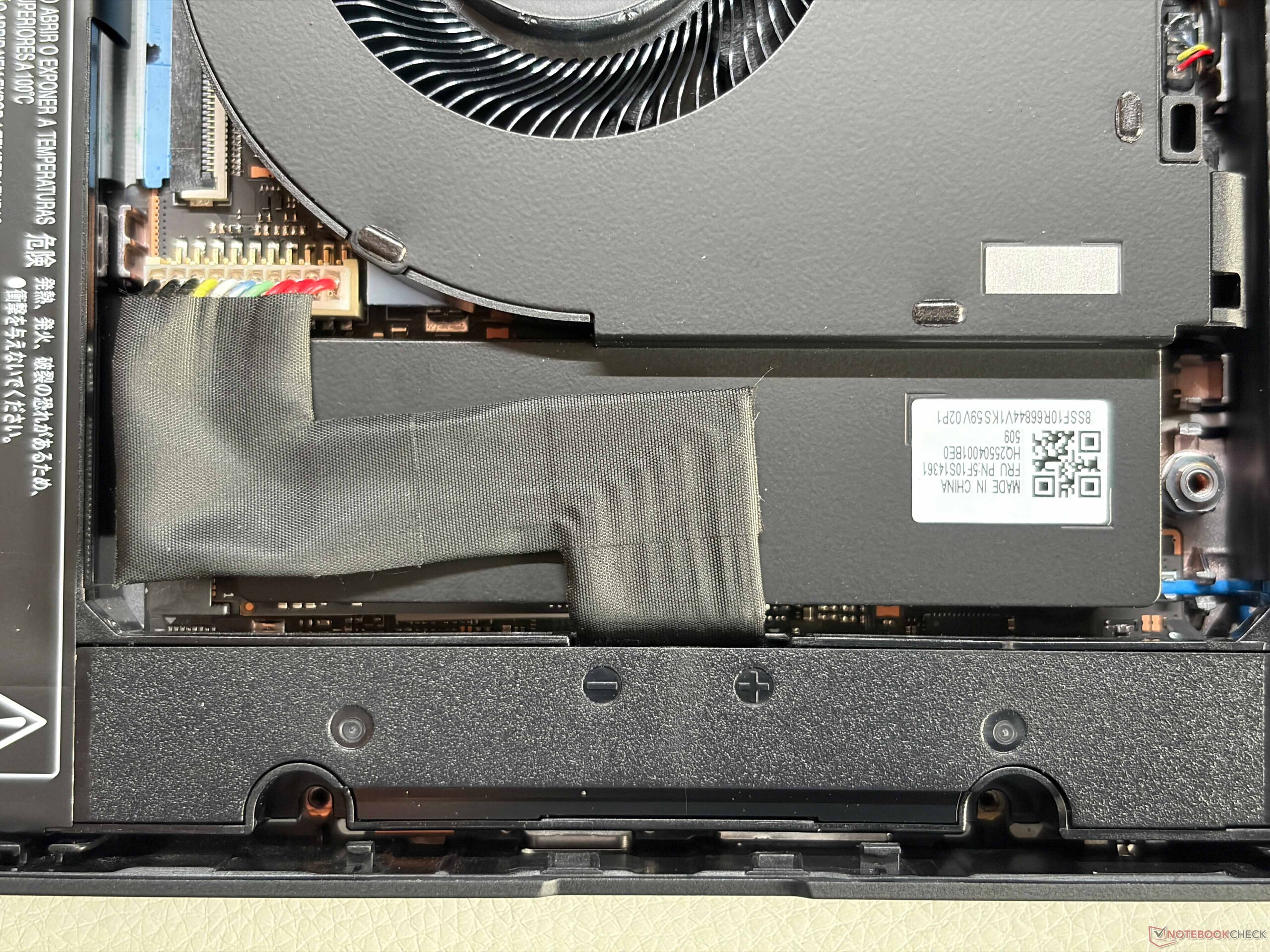 À l'intérieur, l'agencement a également été repensé. Les batteries sont désormais positionnées de part et d'autre, avec un seul ventilateur situé au centre. Le SSD M.2 2280 se trouve en dessous et peut être remplacé, bien qu'il faille d'abord débrancher un câble de connexion. Malgré son prix élevé, l'appareil ne prend toujours pas en charge le Wi-Fi 7.