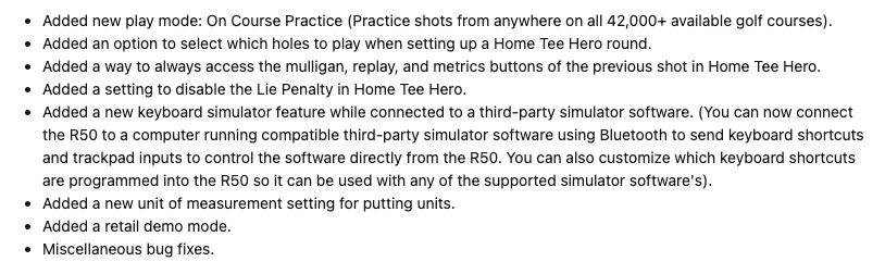 Avec la version 4.80 du logiciel, les utilisateurs de l'Approach R50 bénéficient d'une multitude de nouvelles fonctionnalités. Il y a un nouveau mode de jeu, On Course Practice, qui vous permet d'essayer différents coups sur plus de 42 000 parcours de golf. Les utilisateurs peuvent désormais sélectionner le trou à jouer lors d'un tour Home Tee Hero, et vous pouvez désactiver la pénalité de lie dans ce mode. De plus, les utilisateurs peuvent désormais accéder aux boutons mulligan, replay et metrics du coup précédent dans Home Tee Hero.