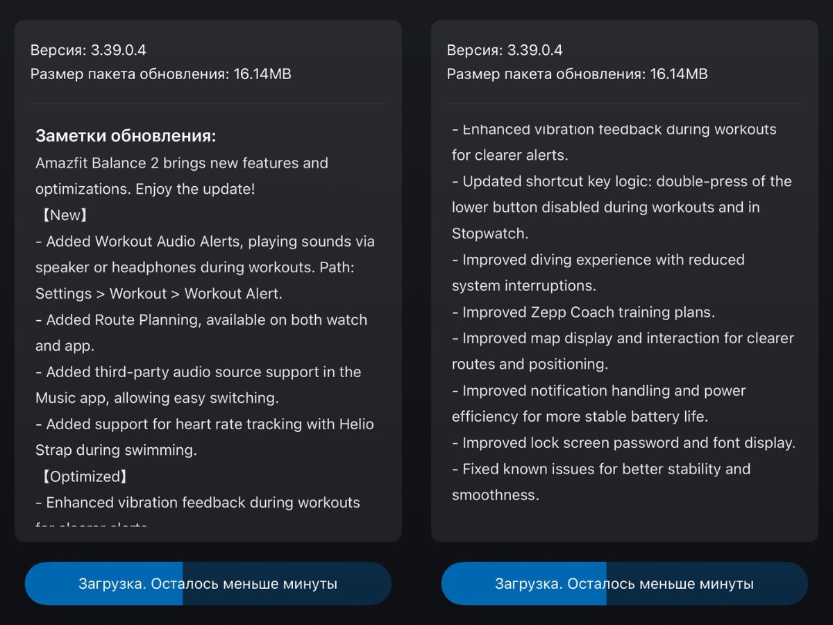 La version 3.39.0.4 du micrologiciel apporte également plusieurs améliorations aux utilisateurs de l'Amazfit Balance 2. Il s'agit notamment d'optimisations concernant les vibrations pendant l'exercice, les interférences du système lors de la plongée et l'expérience du plan d'entraînement Zepp Coach. L'affichage de la carte a également été amélioré avec des informations supplémentaires sur les itinéraires, et l'autonomie de la batterie est censée être plus stable. Vous trouverez le journal des modifications complet dans l'image ci-dessous.