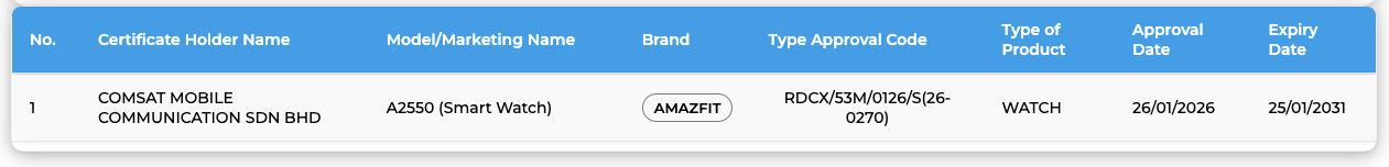 Aujourd'hui, une entrée dans la base de données de Standard and Industrial Research Institute of Malaysia (SIRIM) suggère qu'une autre smartwatch Amazfit est sur le point d'être lancée. Appelée modèle A2550 (Smart Watch), elle a été enregistrée par Comsat Mobile Communications Sdn Bhd ; cette société est propriétaire de la marque Amazfit. Outre le fait que l'appareil a obtenu la certification correspondante le 26 janvier, il n'y a pas d'autres détails sur le produit.