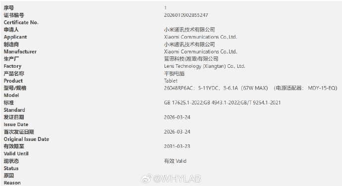 Le Redmi K Pad 2 vient d'être certifié en Chine, ce qui laisse présager une sortie prochaine. La tablette porte le numéro de modèle "26048RP6AC", et le listing confirme la prise en charge d'une charge filaire de 67 W, une nouveauté par rapport à la Redmi K Pad 2 Redmi K Pad. Bien que les détails de la tablette ne soient pas confirmés, il semble probable que la Redmi K Pad 2 soit une mise à jour itérative, les changements les plus probables étant l'introduction de la technologie MediaTek Dimensity 9500 de MediaTek de MediaTek, ainsi qu'une batterie plus grande que celle de 7 500 mAh du modèle de l'année dernière.