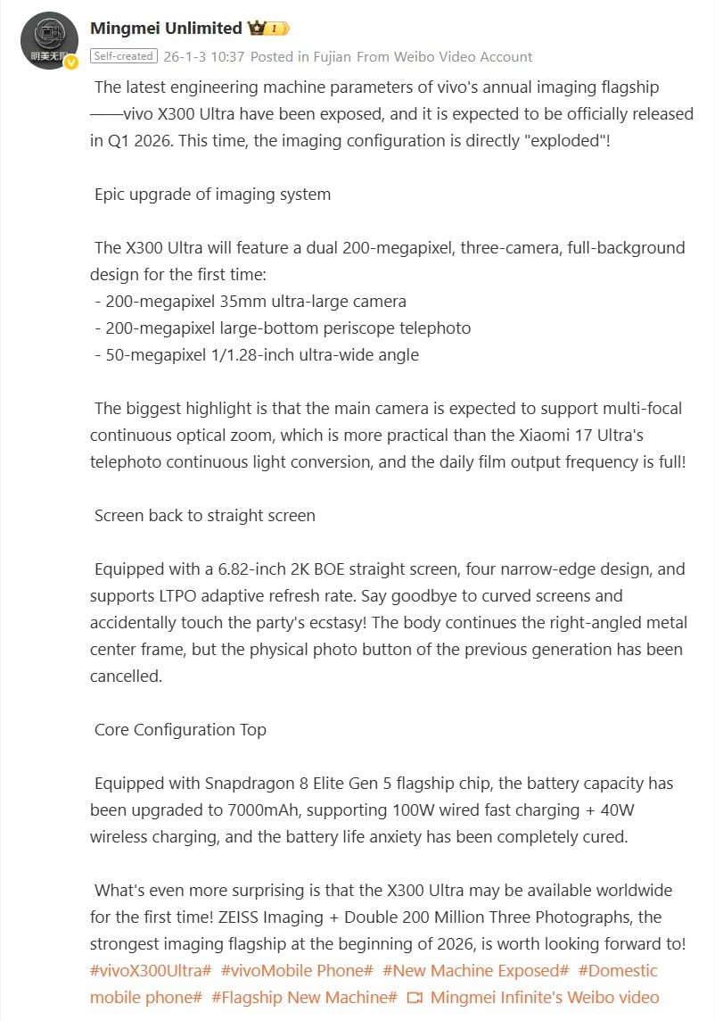 Le premier week-end de l'année nous apporte une rumeur assez spectaculaire sur le Vivo X300 Ultra, qui devrait être le premier flagship Vivo Ultra à être lancé au niveau mondial et qui devrait faire ses débuts au premier trimestre, probablement en mars. Selon un utilisateur de Weibo (voir la capture d'écran ci-dessous), le Vivo X300 Ultra sera doté d'un appareil photo principal 35 mm de 200 mégapixels, d'un téléobjectif périscopique de 200 mégapixels et d'un grand appareil photo ultra-large de 1/1,28 pouce de 50 mégapixels, ce qui n'est pas vraiment une nouveauté.