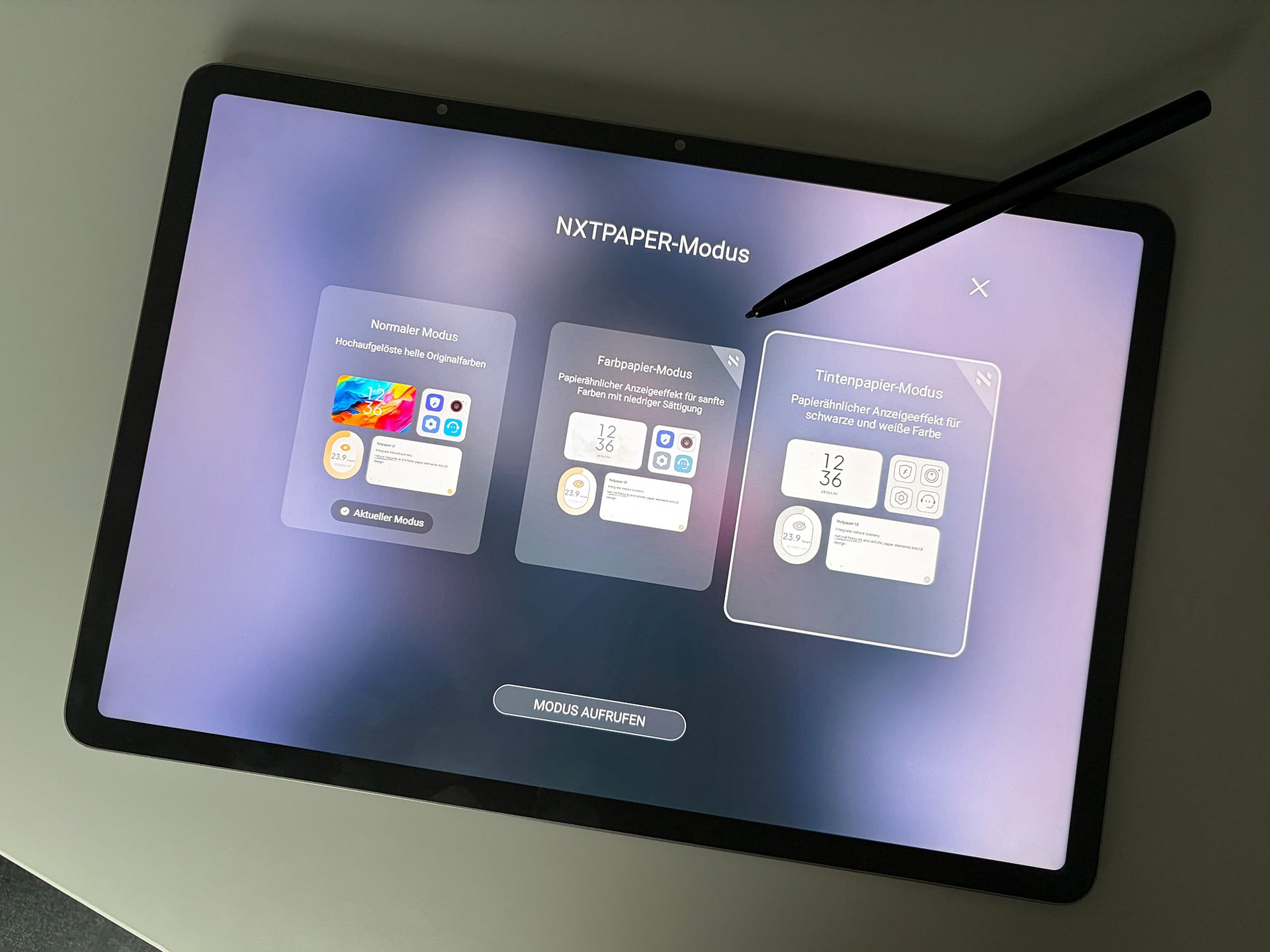 Le mode d'affichage peut être modifié à l'aide d'un bouton dédié. Outre le mode standard, il existe un mode Papier couleur conçu pour simuler du papier coloré, ce qui donne une image beaucoup plus chaude, avec une saturation plus faible et des couleurs plus douces. Le troisième mode, appelé mode Papier d'encre, est limité à une sortie monochrome, similaire à celle d'un lecteur de livres électroniques. Cependant, il n'y a pas de véritable écran E Ink, et nous aurions aimé voir un meilleur étalonnage pour la reproduction des couleurs.