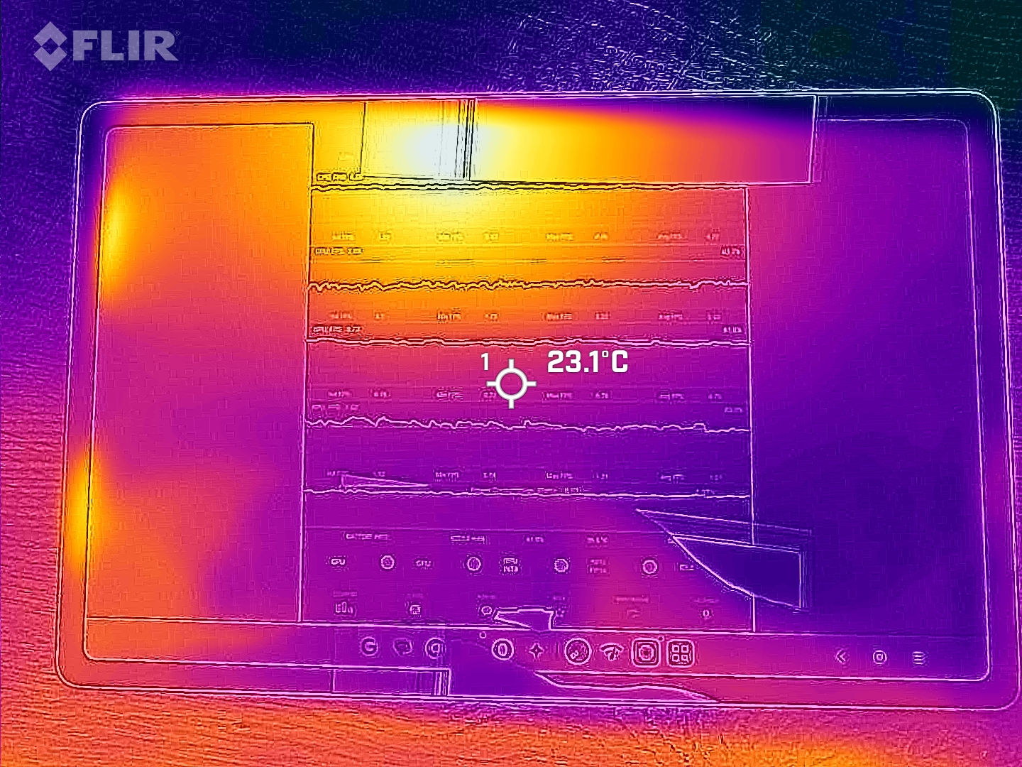 (+) La température maximale du côté supérieur est de 31.4 °C / 89 F, par rapport à la moyenne de 33.7 °C / 93 F, allant de 20.7 à 53.2 °C pour la classe Tablet.