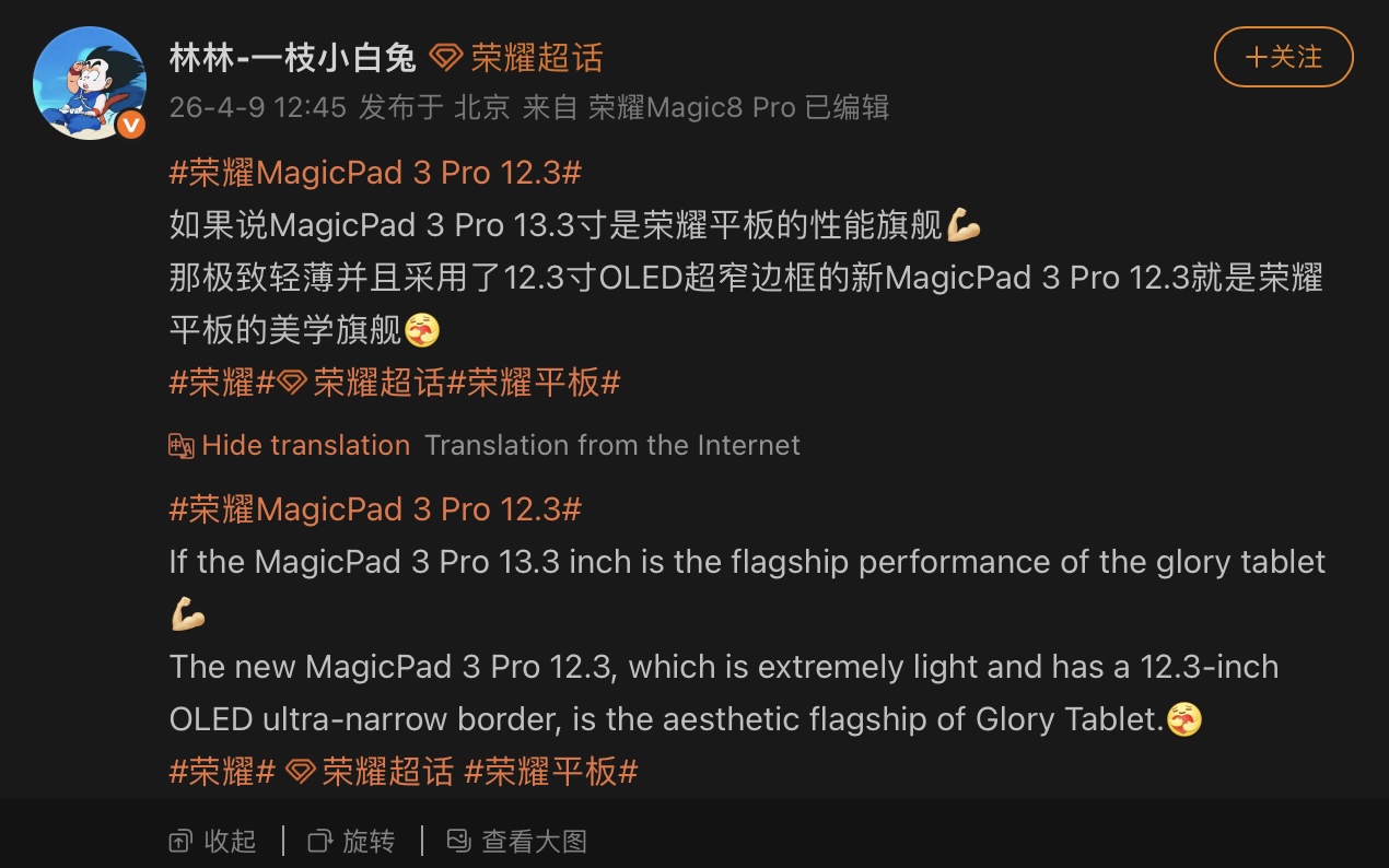 Le post Weibo a également révélé que la tablette OLED MagicPad 3 Pro 12,3 pouces ne pèsera que 440 grammes, soit environ 14,11 onces. Le design général de la tablette semble être identique à celui de la variante IPS, avec deux caméras à l'arrière et des bordures ultrafines à l'avant. D'autres détails concernant la tablette n'ont pas encore été révélés, et il en va de même pour son prix et sa disponibilité.