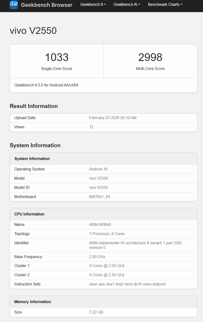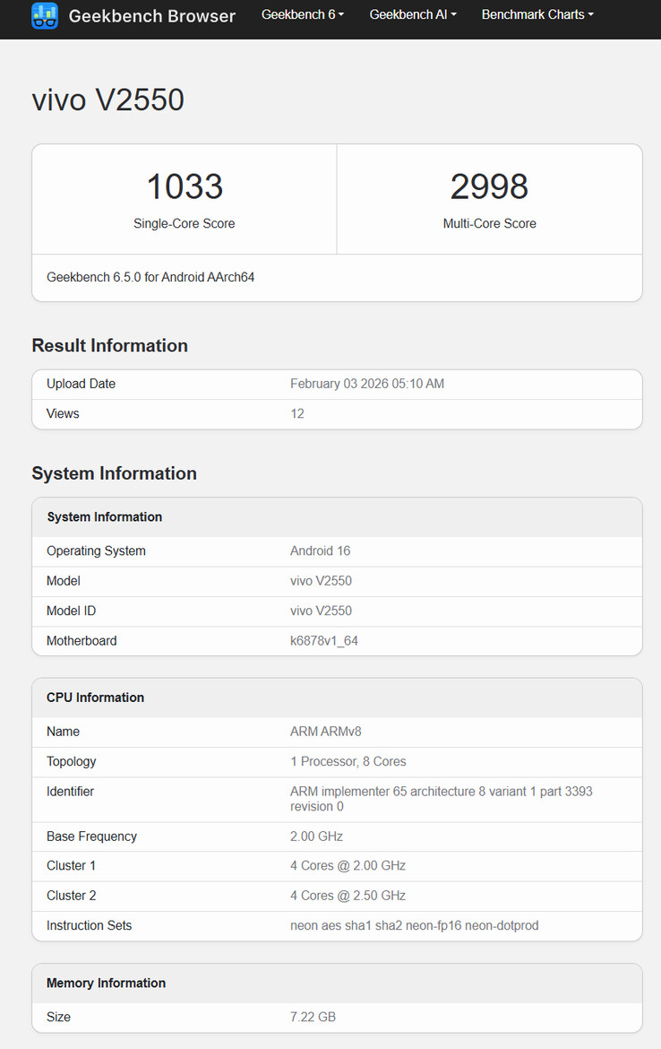 Une récente fuite sur Geekbench confirme les dires de PassionateGeekz, bien que l'on ne sache pas exactement en quoi le Dimensity 7360 Turbo diffère du Dimensity 7360 normal. Quoi qu'il en soit, le V70 FE serait également doté d'une batterie de 7 000 mAh qui supporte une charge filaire de 90 W et d'un écran AMOLED de 6,83 pouces affichant une résolution de 1,5K et un taux de rafraîchissement de 120 Hz.
