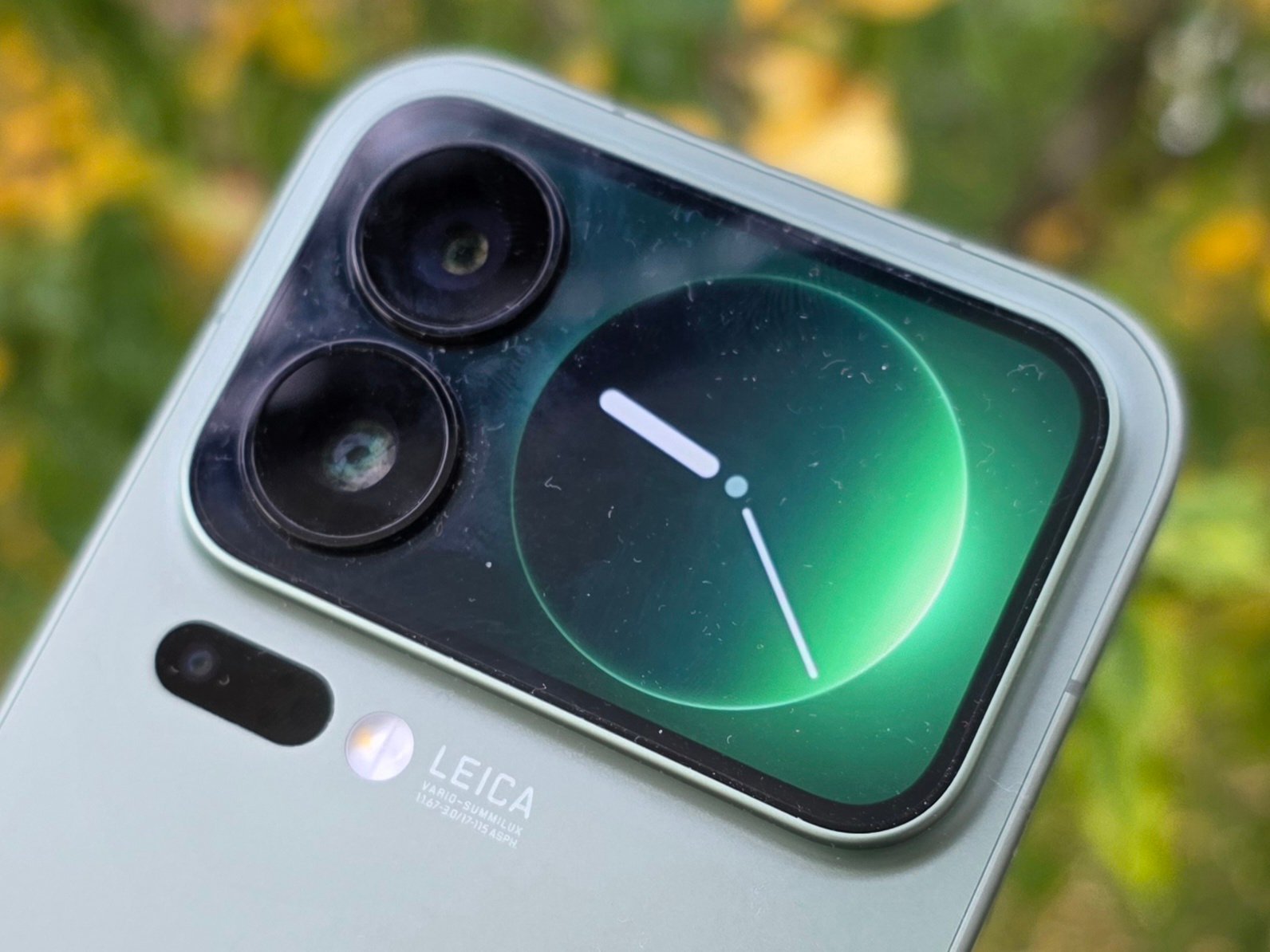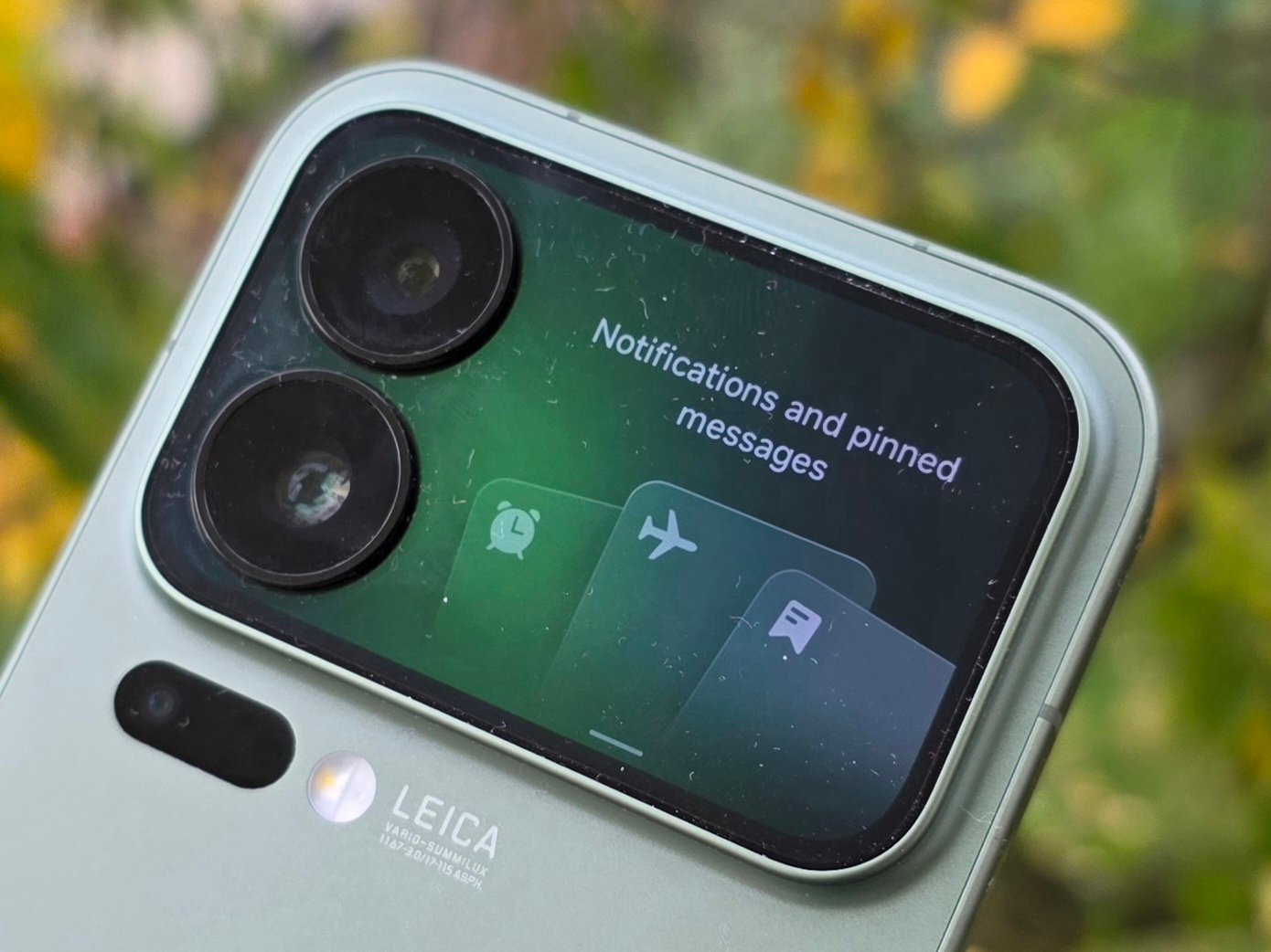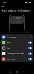 Le panneau OLED arrière est très facile à lire grâce à sa luminosité élevée et à la netteté de l'affichage. En plus d'afficher l'heure et de prendre des appels, les utilisateurs peuvent glisser vers le bas pour afficher des messages et contrôler des applications individuelles, telles que l'application musicale de Xiaomi. Toutefois, il n'est pas possible d'installer des applications tierces sur l'écran, ce qui limite son utilité au quotidien. Il reste la possibilité d'utiliser les caméras Leica au dos pour les vidéos et les selfies.