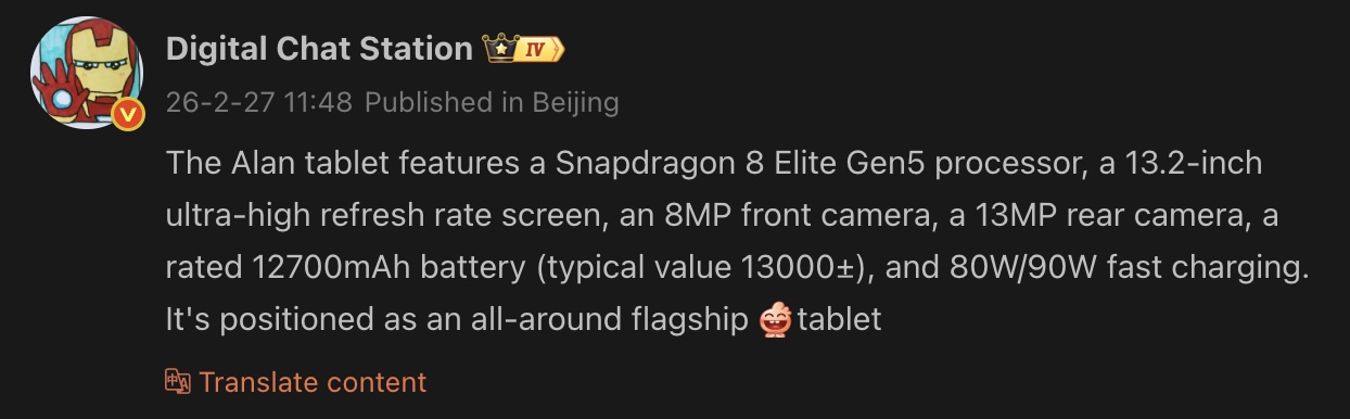 De plus, la fuite indique une caméra arrière de 13 mégapixels et une caméra selfie de 8 mégapixels. Il pourrait être alimenté par le Snapdragon 8 Elite Gen 5 Snapdragon 8 Elite Gen 5le dernier processeur phare de Qualcomm. Le Vivo Pad 6 Pro devrait être doté d'une batterie de 13 000 mAh, contre 12 050 mAh pour son prédécesseur. Il pourrait également prendre en charge la charge rapide jusqu'à 90 W (10K Iniu powerbank actuellement à 20 $ sur Amazon).