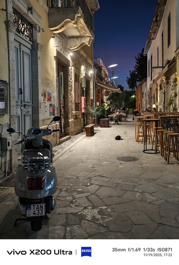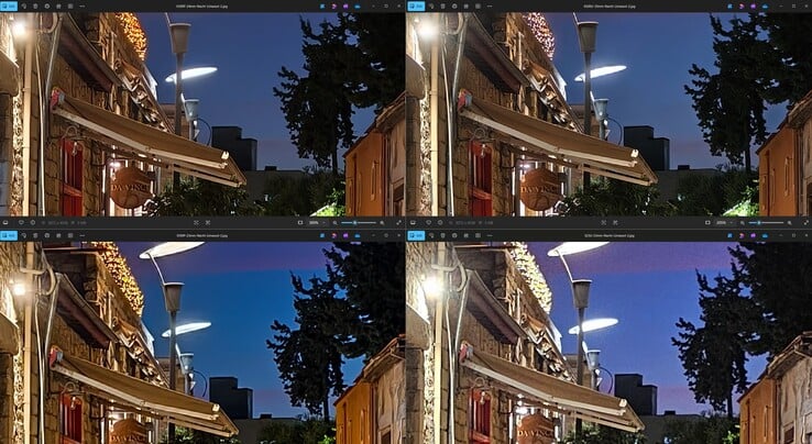Au premier coup d'œil, les lampes surexposées du Galaxy S23 Ultra ressortent, tandis que les trois modèles Vivo maîtrisent beaucoup mieux les hautes lumières. Le Vivo X200 Ultra montre le plus de détails dans les objets éloignés, ce qui n'est pas surprenant compte tenu de sa longueur focale de 35 mm. Rétrospectivement, ce résultat confirme l'abandon par Vivo de l'IMX989 : malgré des capteurs plus petits, le Vivo X100 Pro n'arrive pas à suivre, même à courte distance. Par exemple, à gauche de la moto, le Vivo X300 Pro montre plus de détails que le X100 Pro et le X200 Ultra.