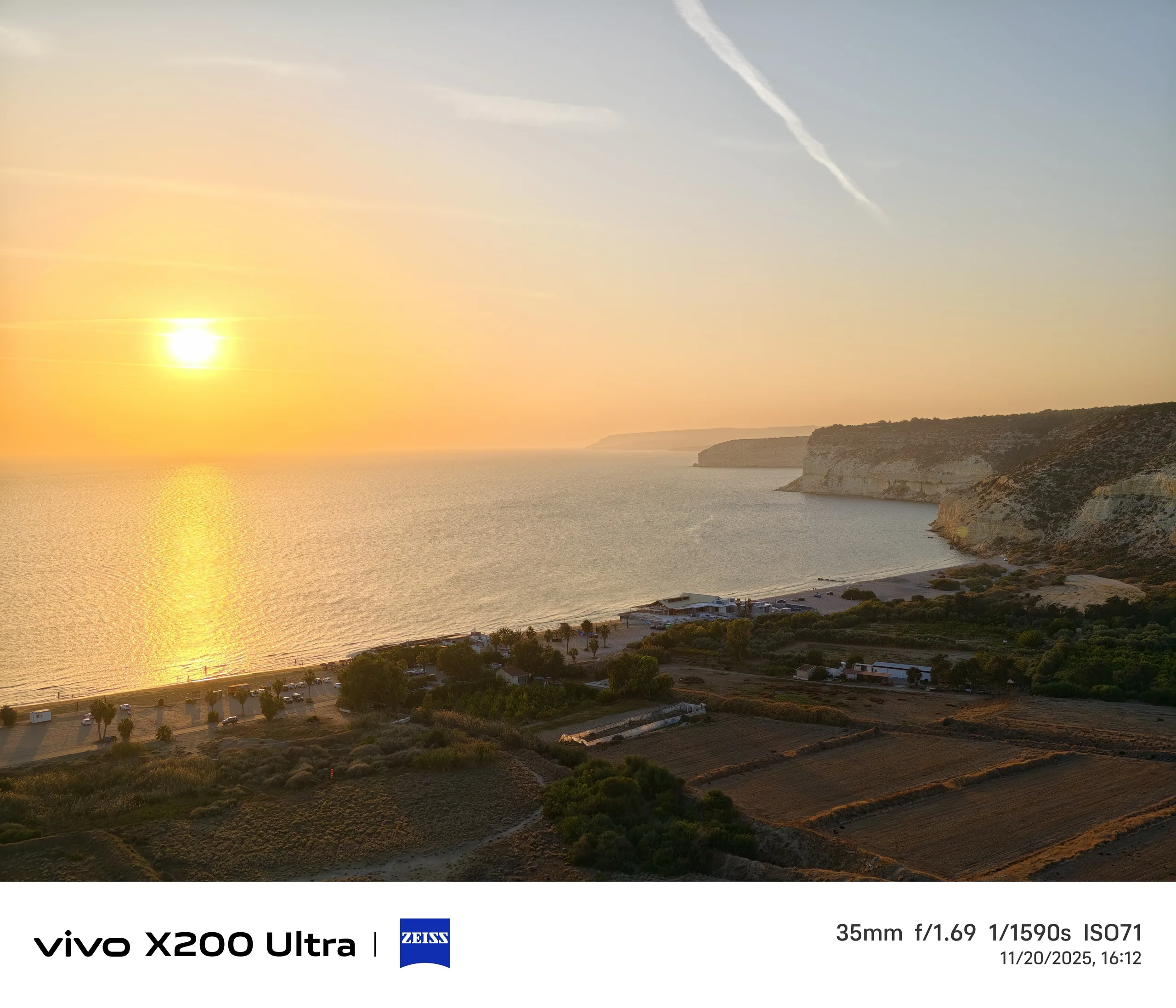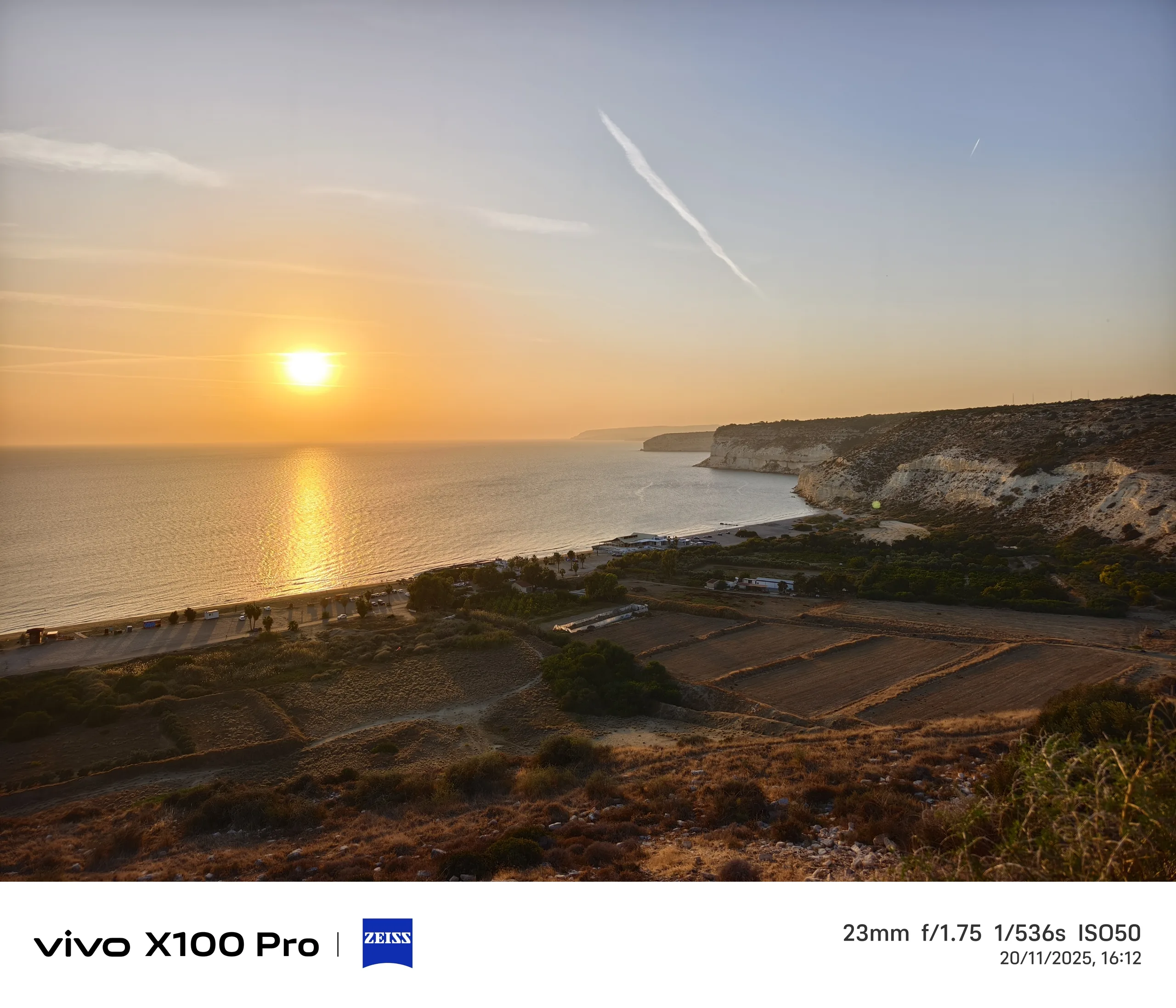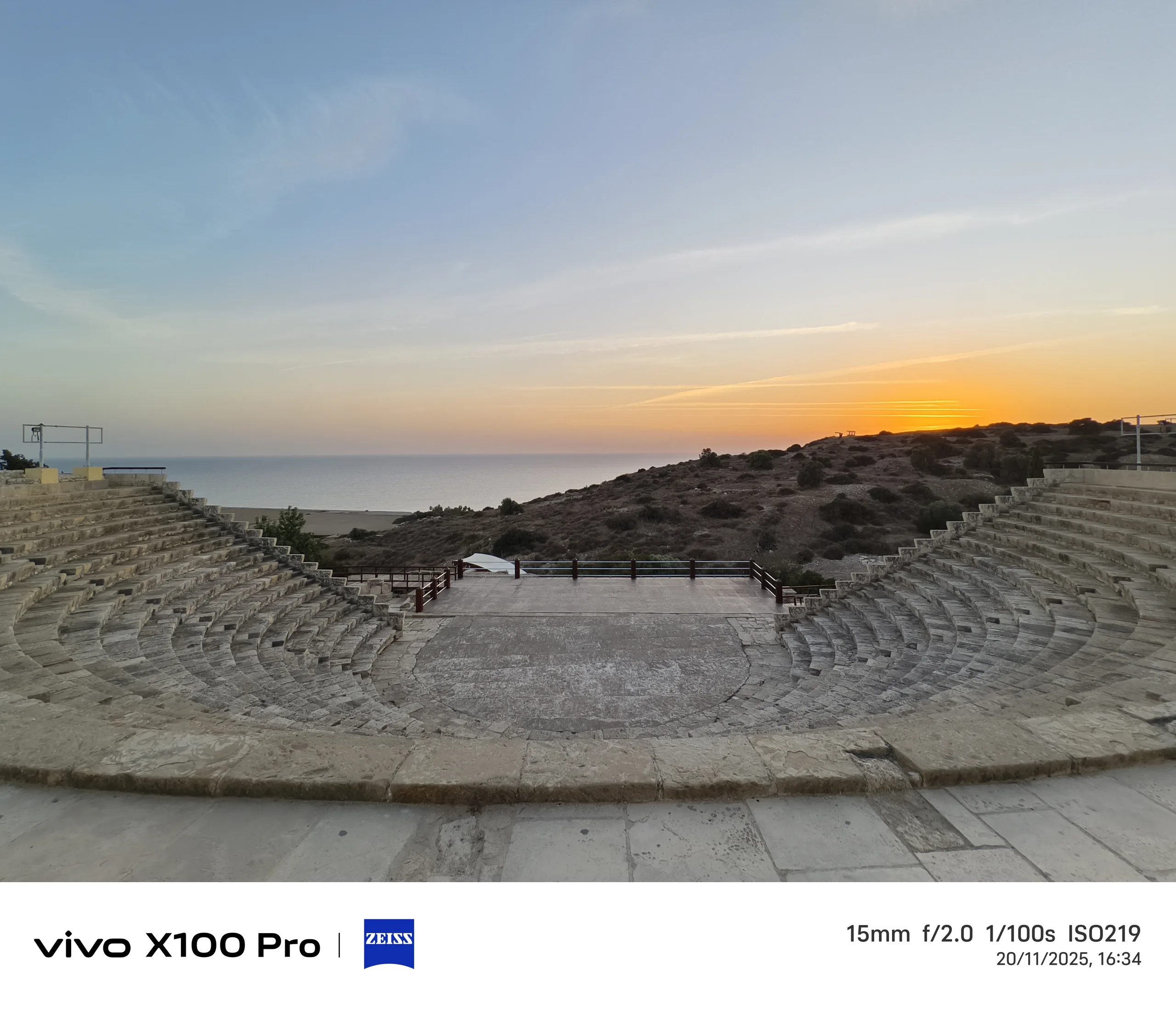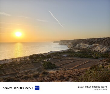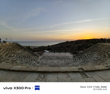 Pour le deuxième exemple, nous retournons à Kourion, en regardant le soleil couchant et la plage de Kourion. Le capteur de 1 pouce du Vivo X100 Pro offre le rendu le plus coloré du coucher de soleil, mais pas nécessairement le plus précis, car le soleil n'était pas aussi rouge à ce moment-là. Bien que le capteur soit le plus grand et que la vitesse d'obturation soit la plus longue, cette photo est également la plus sombre.