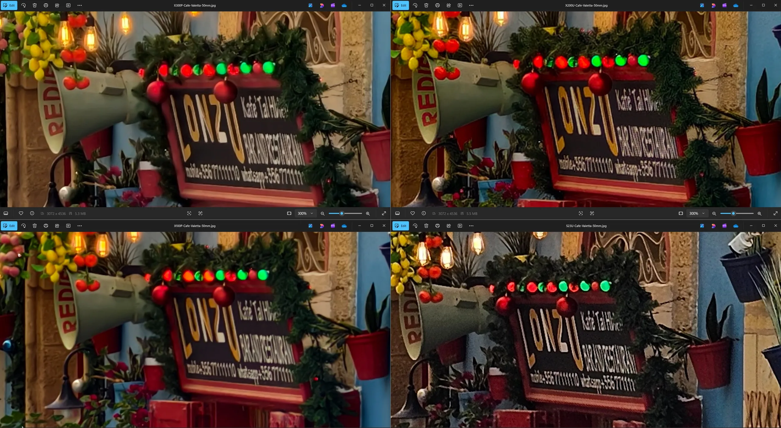 En y regardant de plus près, certaines différences apparaissent dans les détails. Le zoom numérique du Vivo X200 Ultra, qui passe de 35 mm à 50 mm, semble le plus faible des modèles Vivo. Le texte est légèrement plus lisible sur le Samsung, mais les lumières semblent trop blanches. L'appareil photo principal du Vivo X300 Pro préserve le plus de détails sans paraître trop net, tandis que le X100 Pro ne profite pas beaucoup de son capteur de 1 pouce en comparaison et semble un peu trop doux.