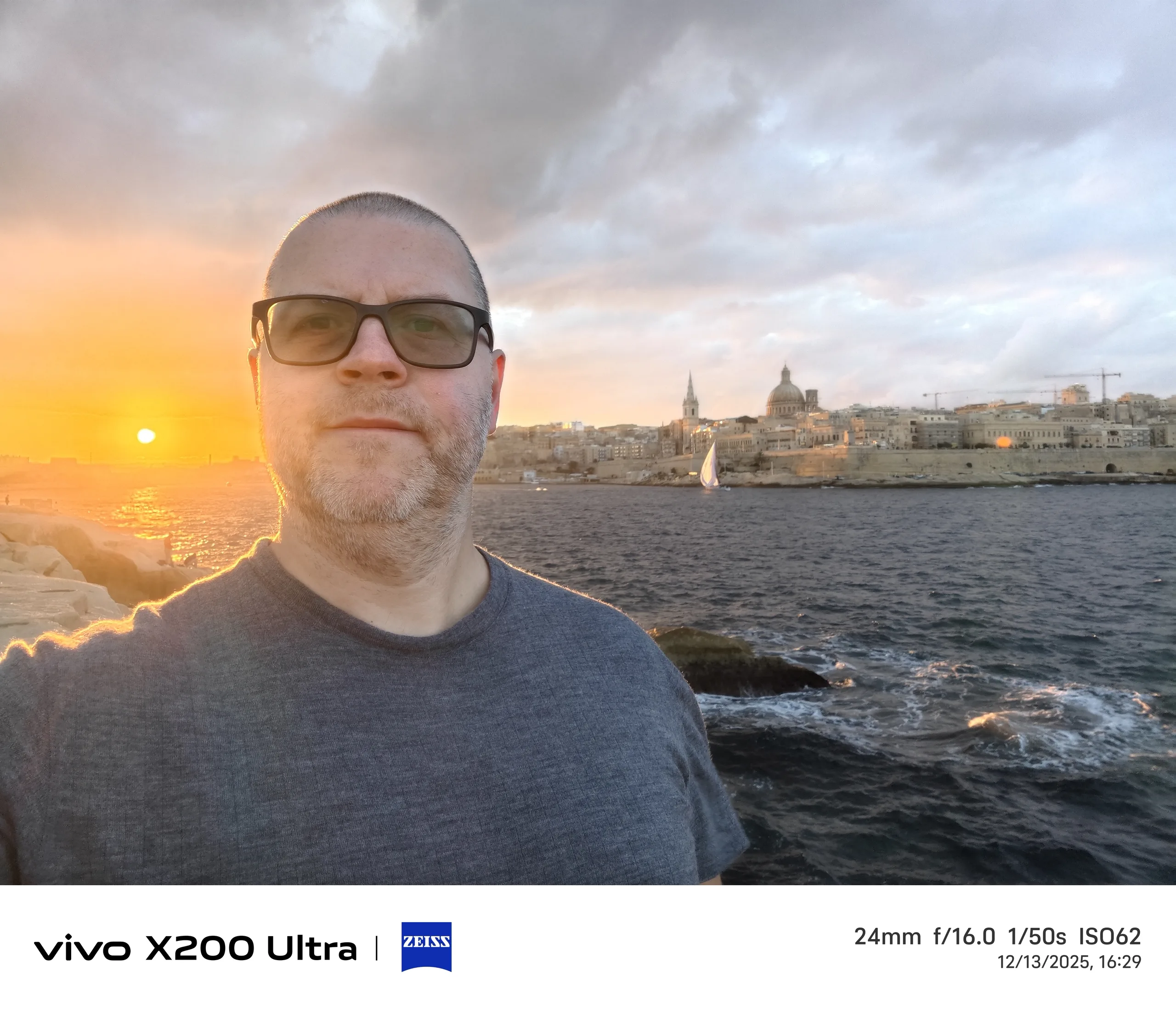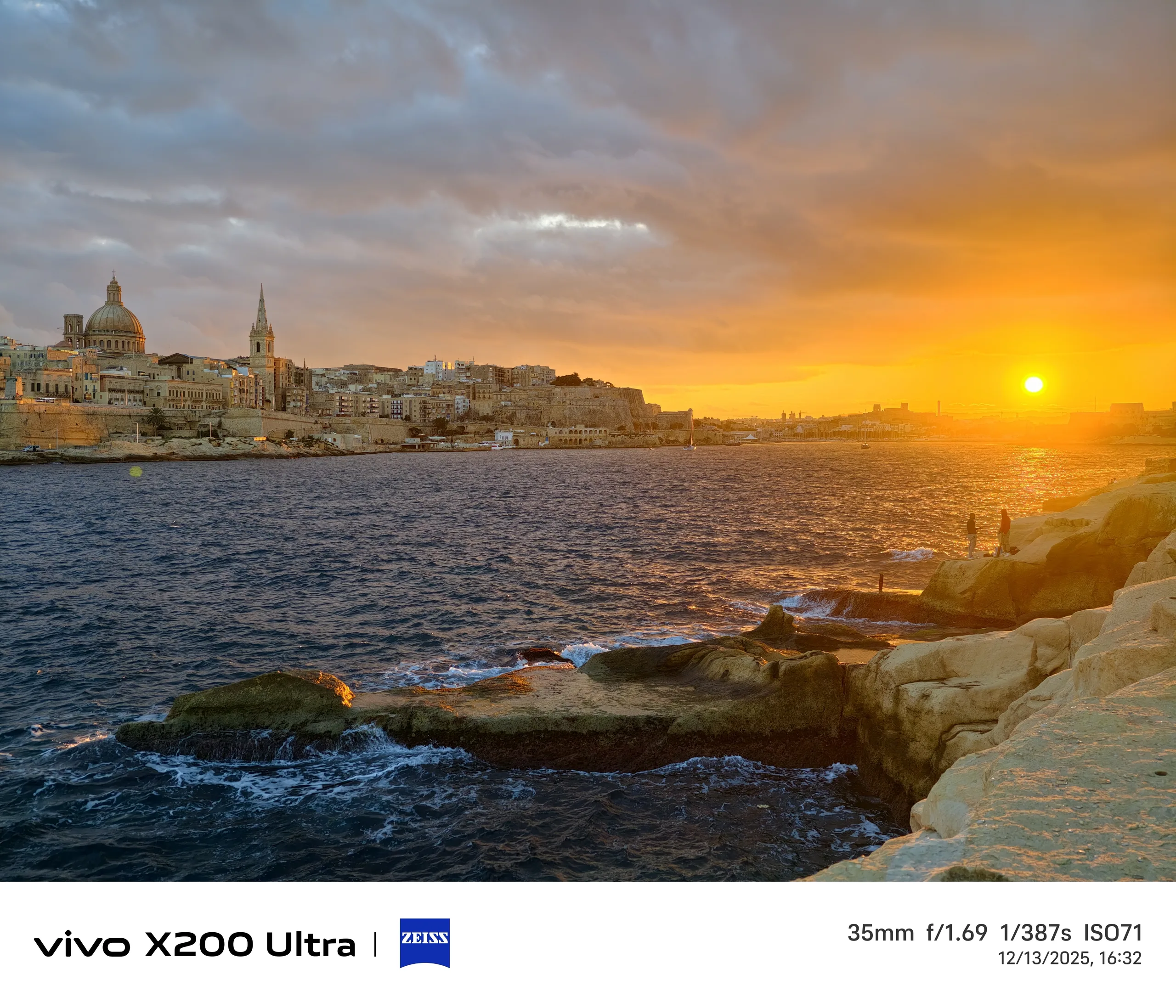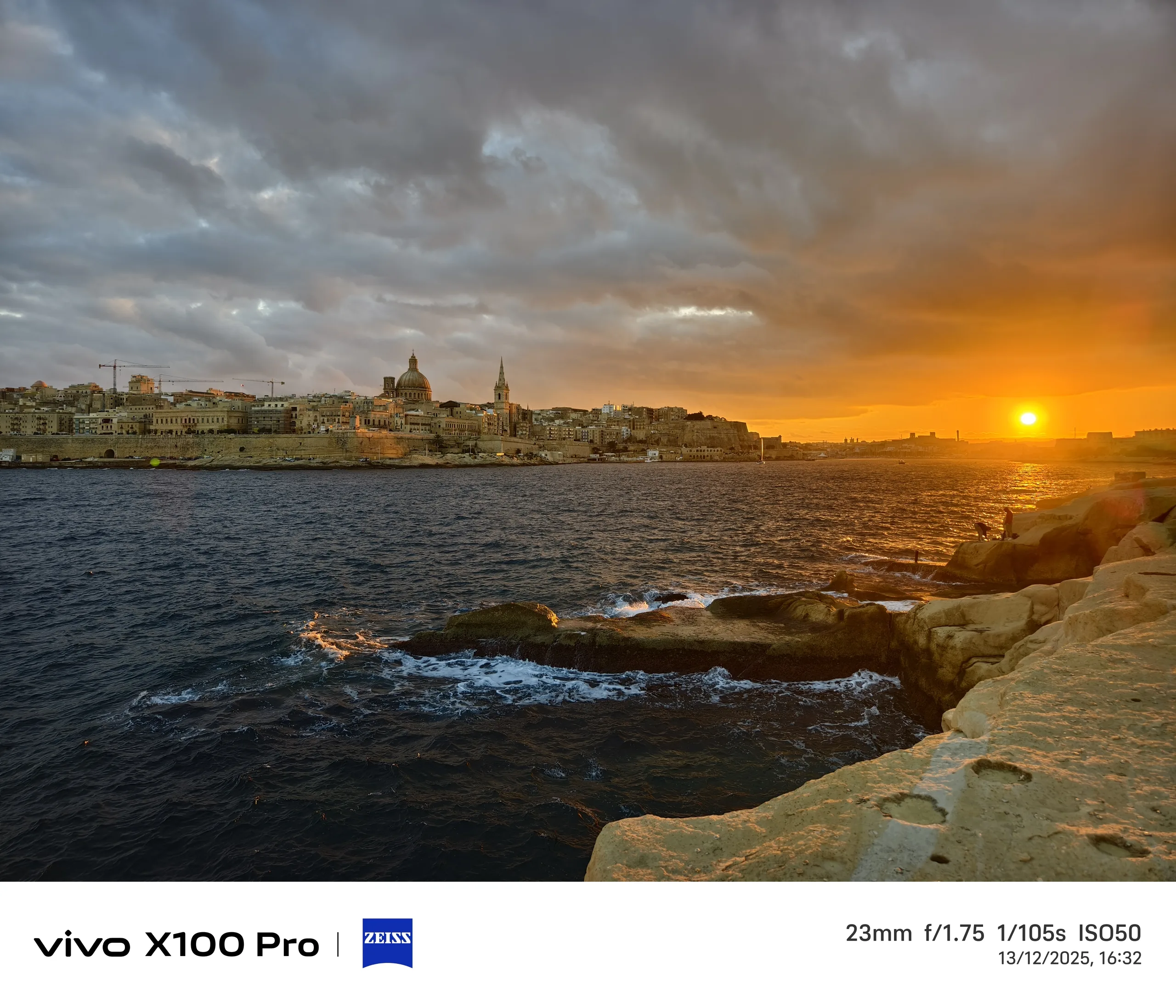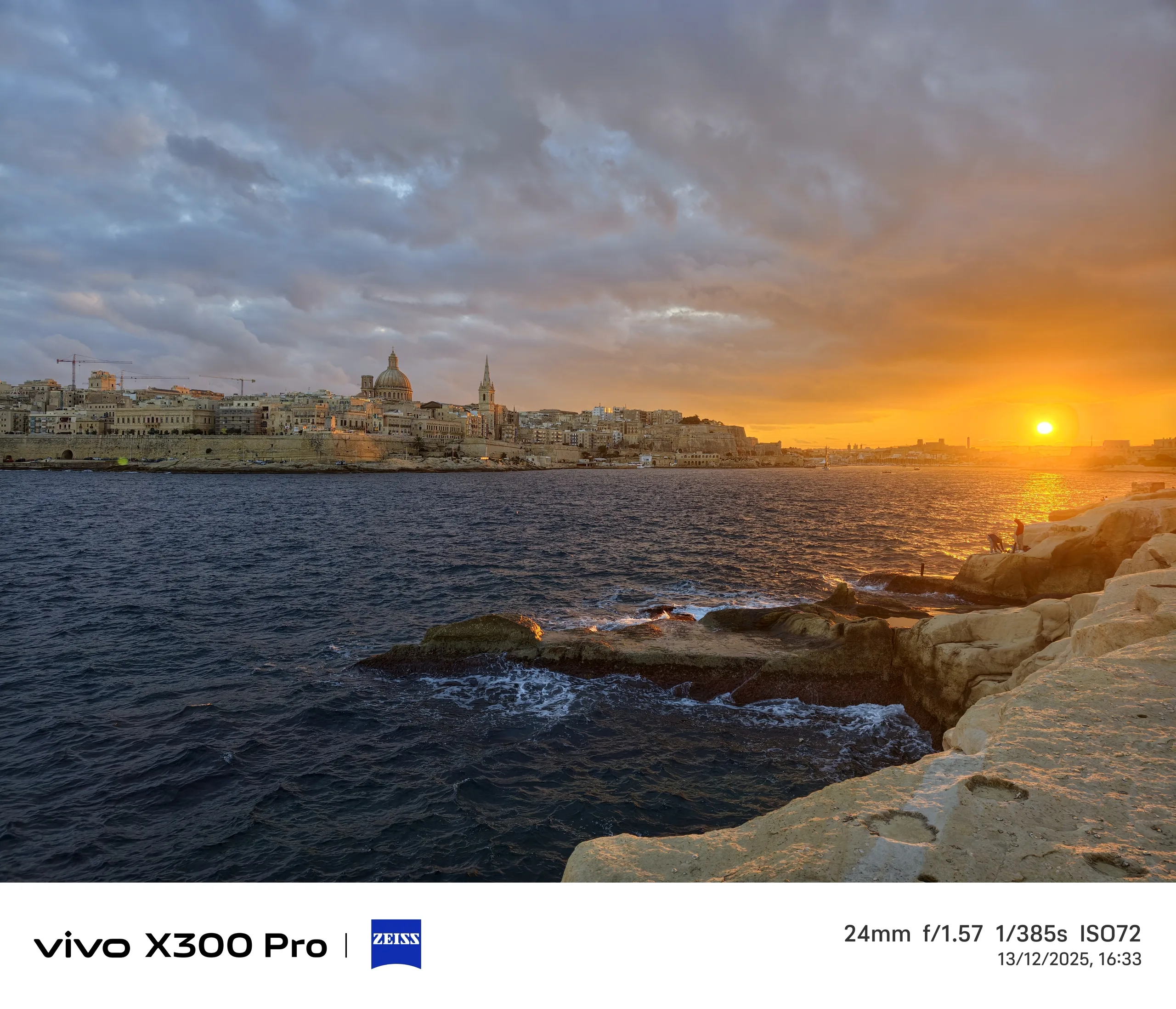 Pour l'exemple suivant, nous nous rendons à Malte et assistons à un coucher de soleil depuis Tigné Point, au nord de La Valette. À mon avis, le Vivo X300 Pro capture de la manière la plus spectaculaire le moment où le soleil émerge brièvement de l'épaisse couverture nuageuse juste avant de se coucher.