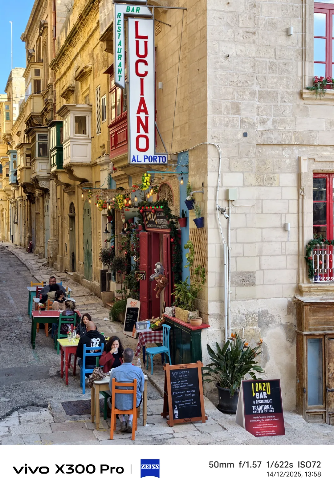 Malte avant Noël est une expérience particulière. Au lieu de la neige, de nombreux quartiers de la ville présentent des rues avec des éclairages de Noël parfois très élaborés, ce qui permet également de réaliser un bon test en mode nocturne à main levée - par exemple sur Triq Il-Vitorja à Senglea ou le long de l'artère principale de La Valette, qui était bondée dans la soirée. Ce sont des conditions assez difficiles pour un test de zoom 10x. Avec un trépied, il aurait bien sûr été possible d'obtenir de bien meilleurs résultats.