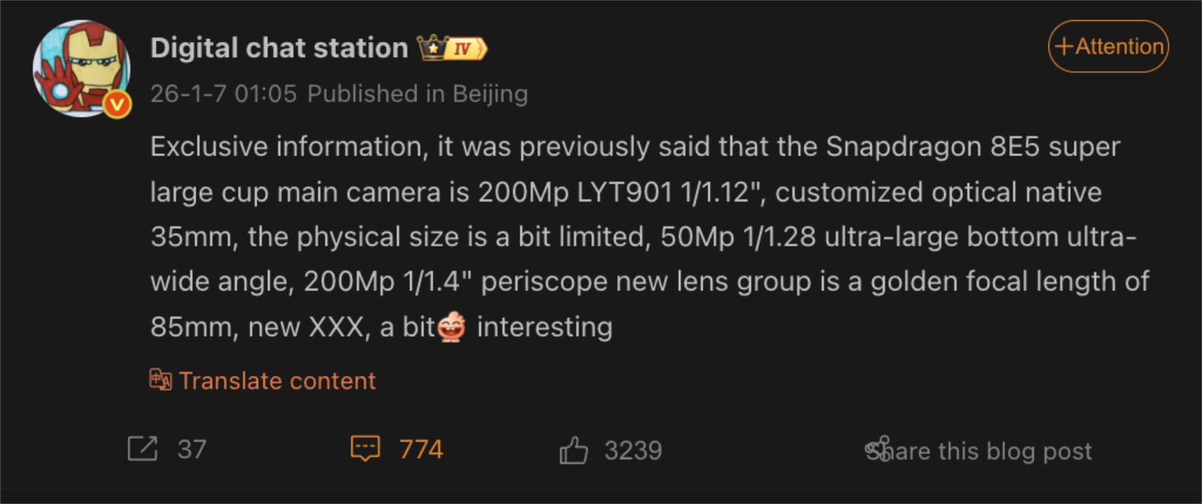 Sur Weibo, la même source affirme que le X300 Ultra rejoindra le Galaxy S26 Ultra et le OnePlus 15 en adoptant le Snapdragon 8 Elite Gen 5 de Qualcomm Snapdragon 8 Elite Gen 5 de Qualcomm. En outre, ils écrivent que le matériel photographique suivant reste prévu :