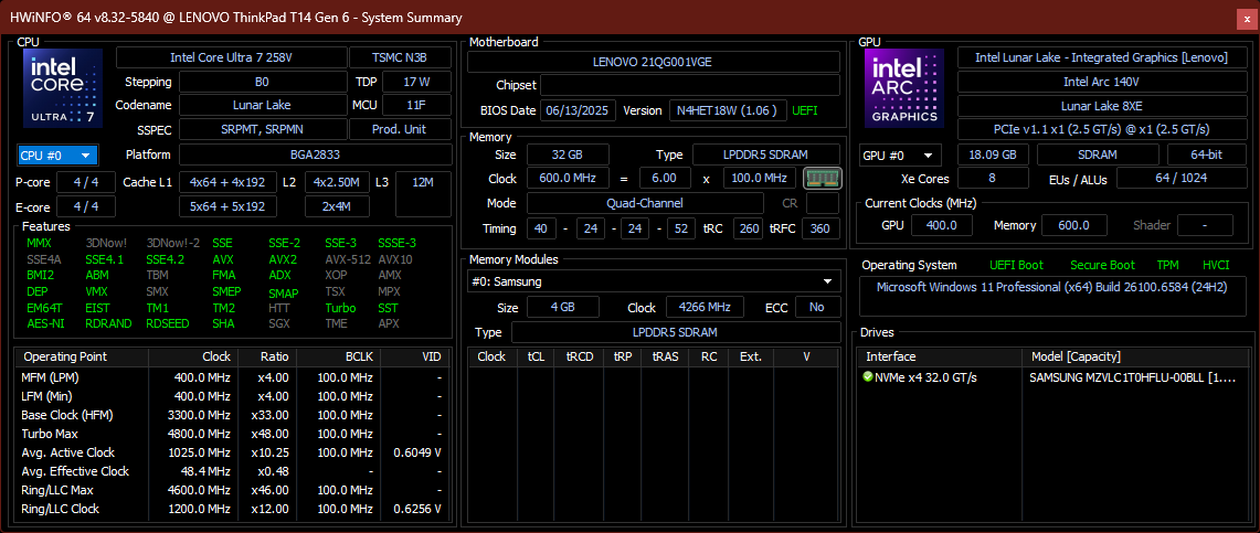 | Lenovo ThinkPad T14 Gen 6 21QG001VGE Intel Core Ultra 7 258V ⎘ Intel Arc Graphics 140V ⎘ 32 Go Mémoire, 1024 Go SSD | Amazon: $2,097.95 Prix de liste: 1960 Euro | 1.5 kg | 22 mm | 14.00" 1920x1200 162 PPI IPS LED | |