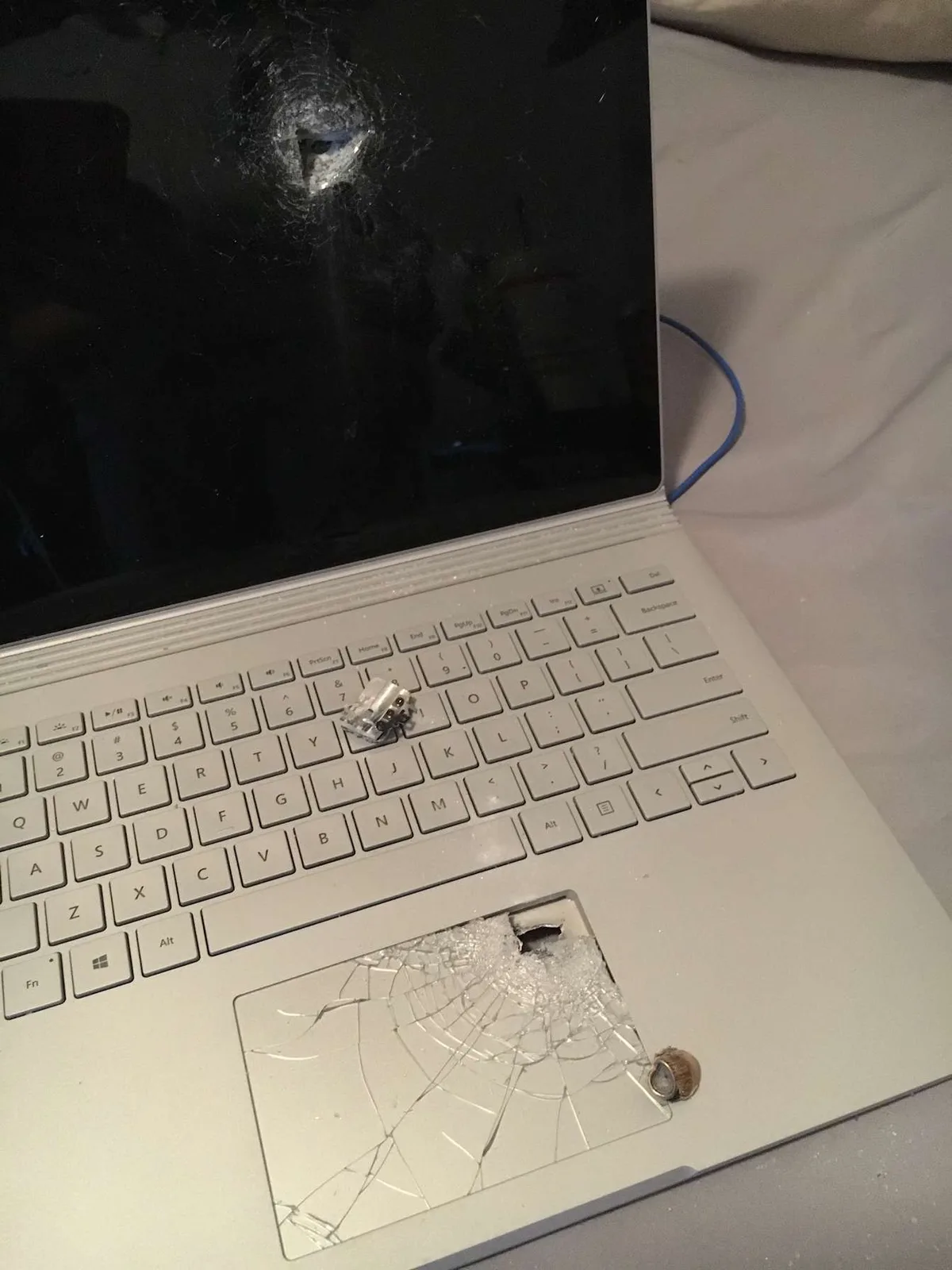 L'utilisateur de Twitter @itsExtreme_ (Aaron) a rapporté qu'un Microsoft Surface Book lui a sauvé la vie en prenant une balle perdue qu'un locataire a tiré du sol en dessous. Aaron a tweeté une image de son Surface Book après l'incident. L'ordinateur portable convertible était nettement moins résistant à l'usure, la balle ayant pénétré l'écran et le tapis de souris.